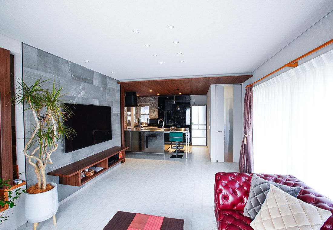 リフォームで一新したLDKでは、メタルスモークの「iNO」が空間にしっくりと溶け込み、上品な輝きを放っています。