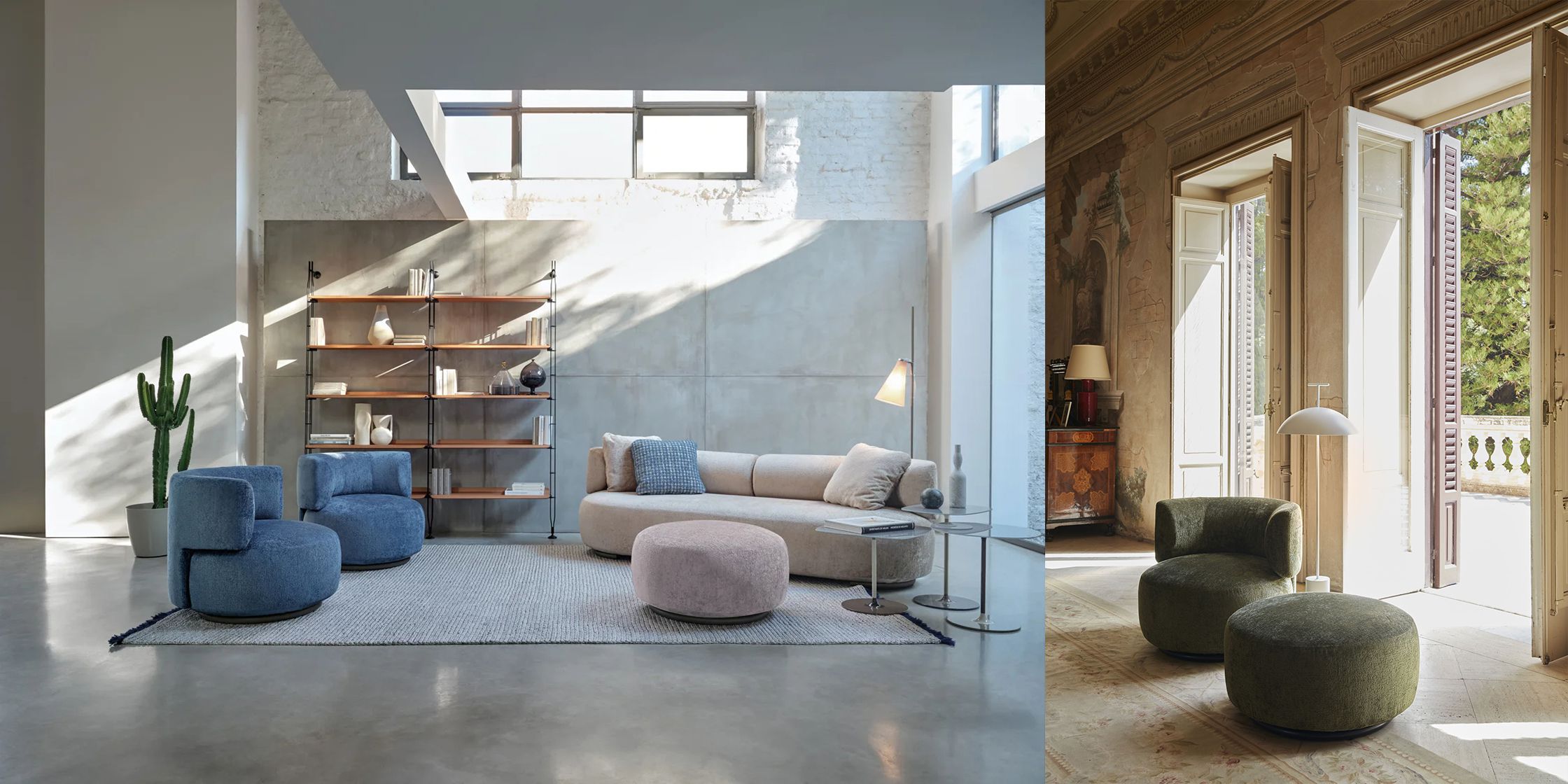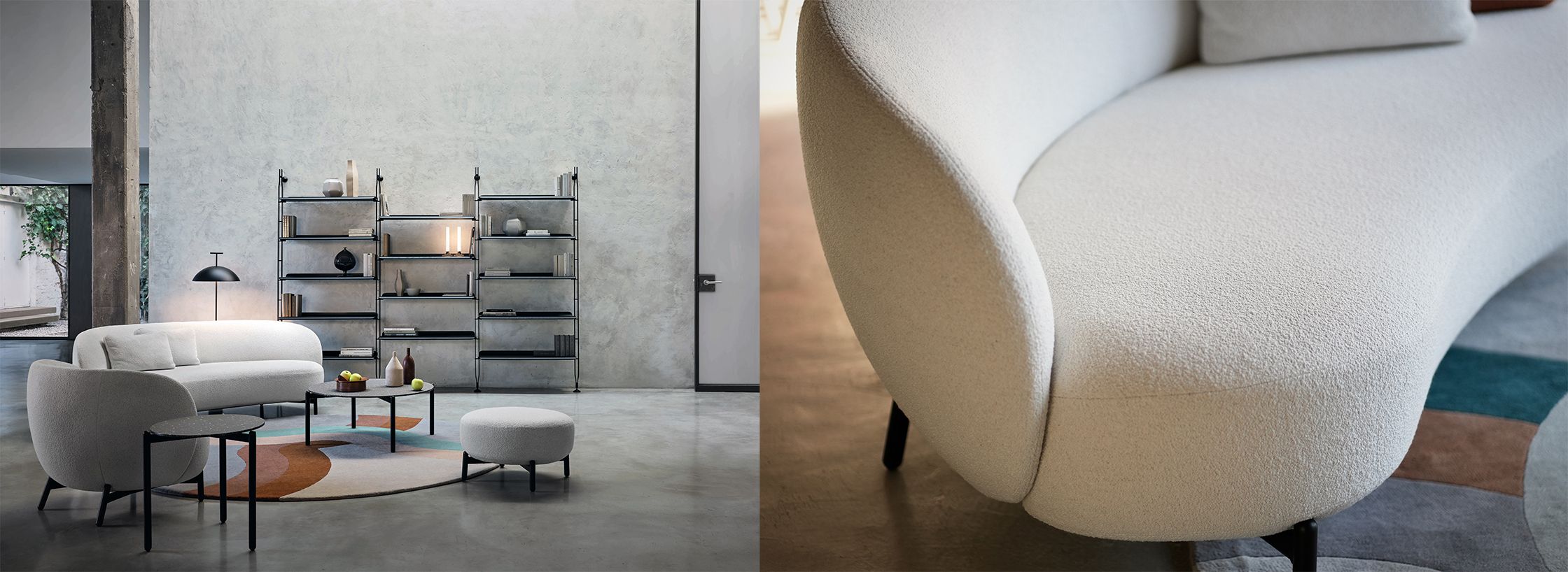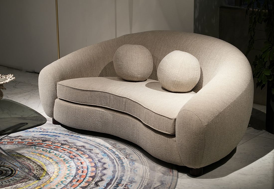 ソファは弧を描き、アームチェアやオットマンは丸みのあるやさしいフォルムです。