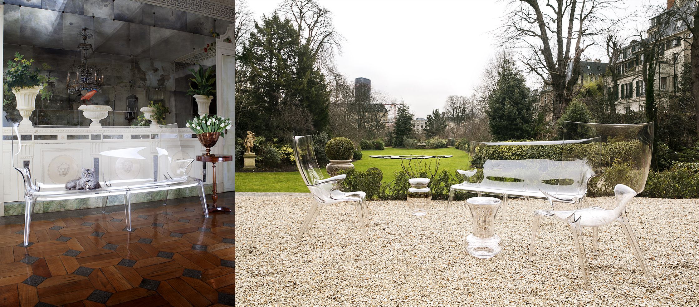 アンクルジャックは、一体成形透明ポリカーボネート製の革新的なデザインのソファです。視線が透過するデザインと曲線を多用した美しいフォルムが見るものを魅了します。