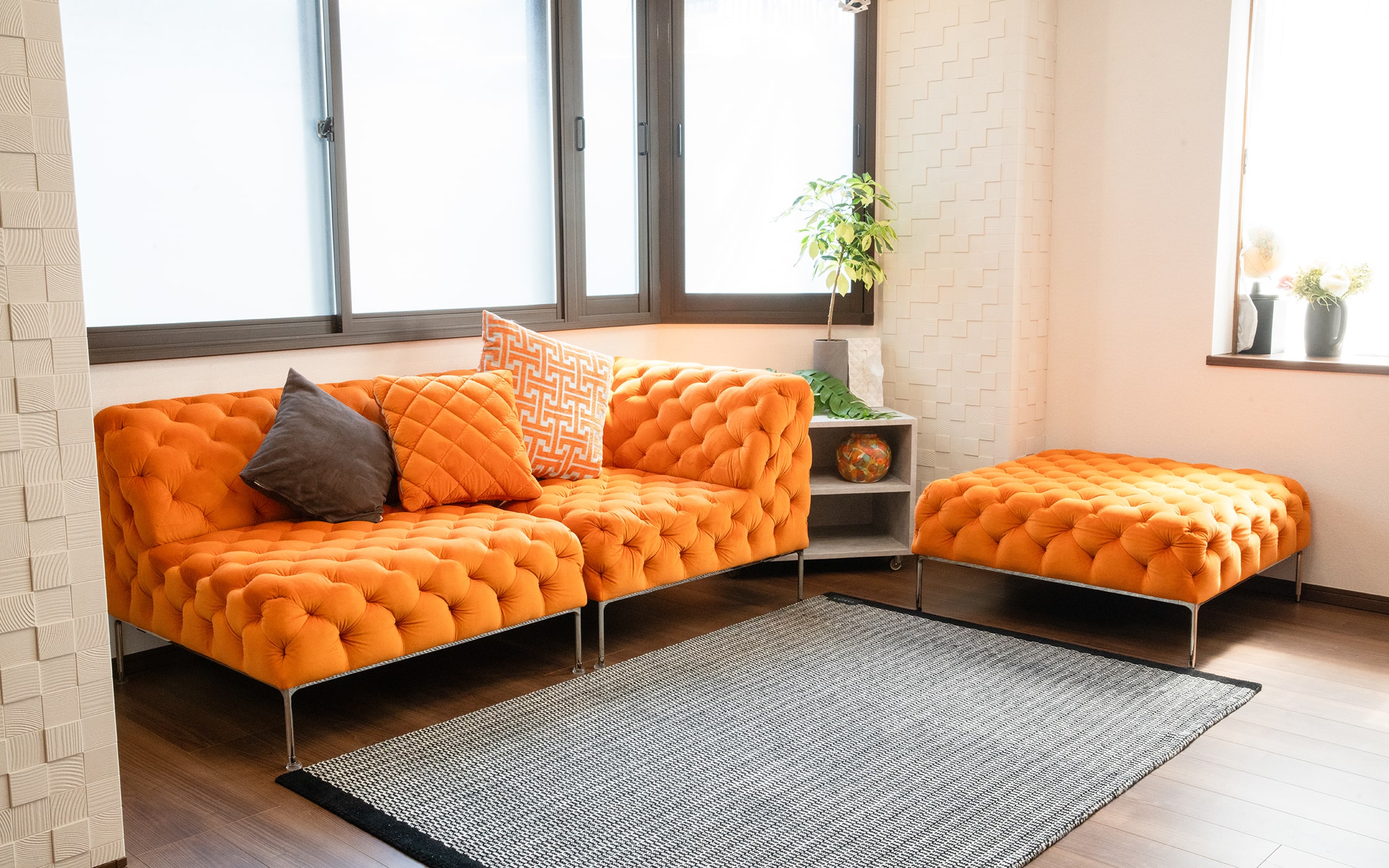 オレンジがラッキーカラーだという菰田様の心を射止めたもう一つのアイテム、それがベルベット調のファブリックに包まれた、「集(つどい)」シリーズのソファです。