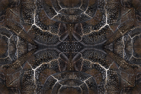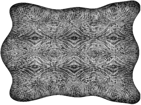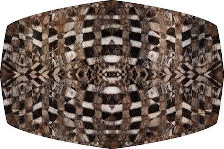 ブラック、グレー、ブラウン、ホワイトのニュアンスの異なる印象的なパターンを万華鏡のように散りばめました。形状は丸みを帯びた六角形で、貴石のような大胆さを表現しています。