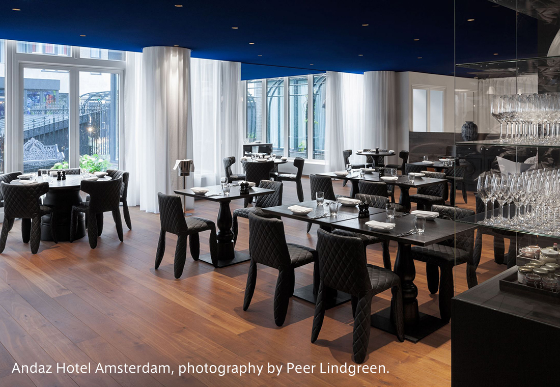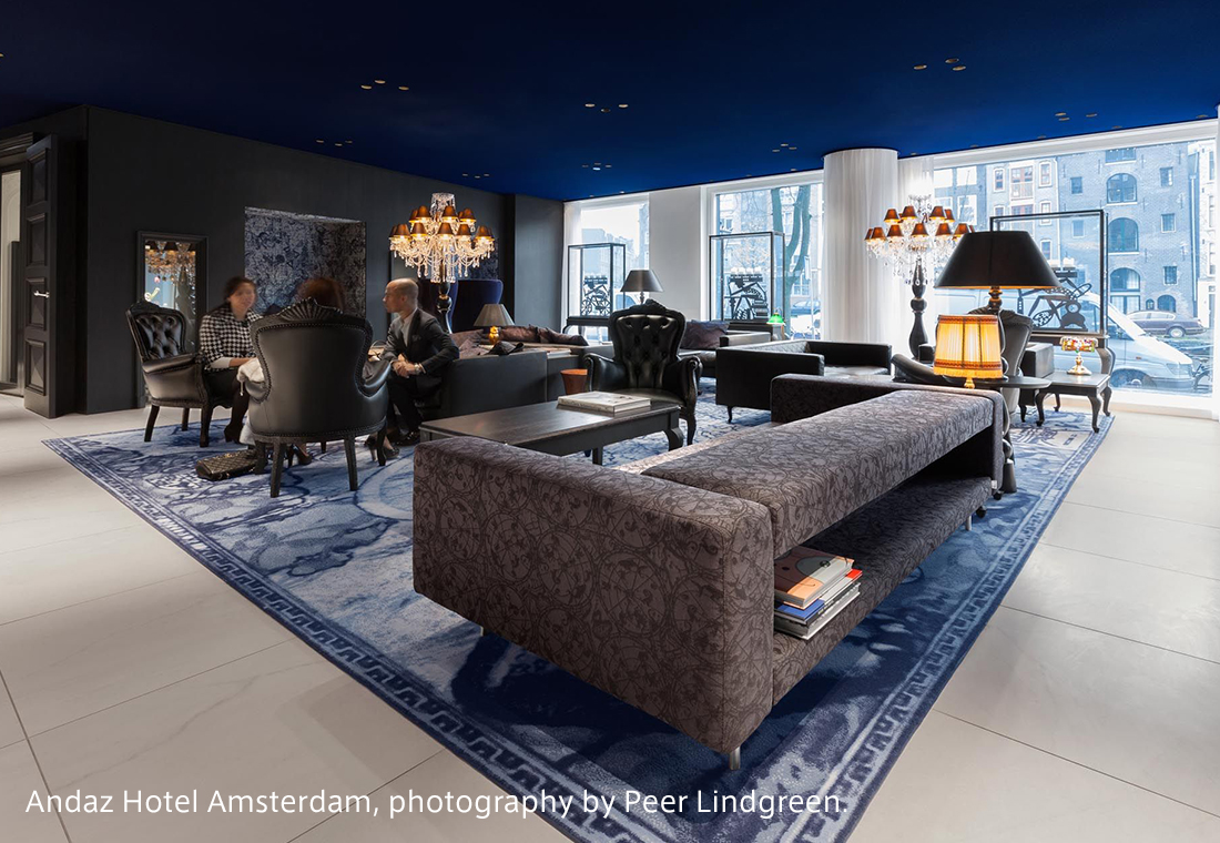ロビーから客室までマルセル・ワンダースが内装全般のデザインを手掛ける。moooiの照明や家具も多く採用されており、完成当時は日本からもデザイン関係者が多く訪れ、話題に。