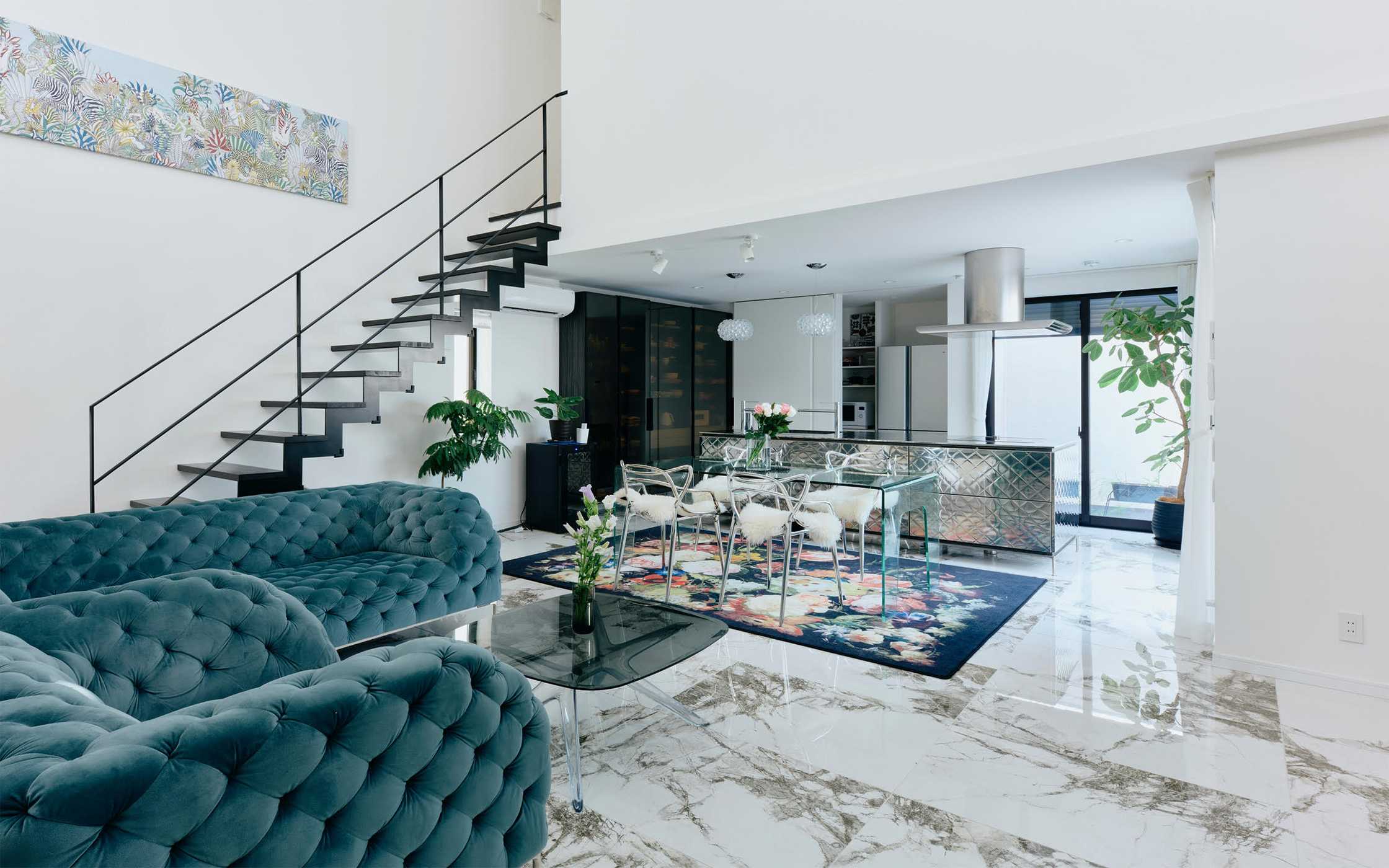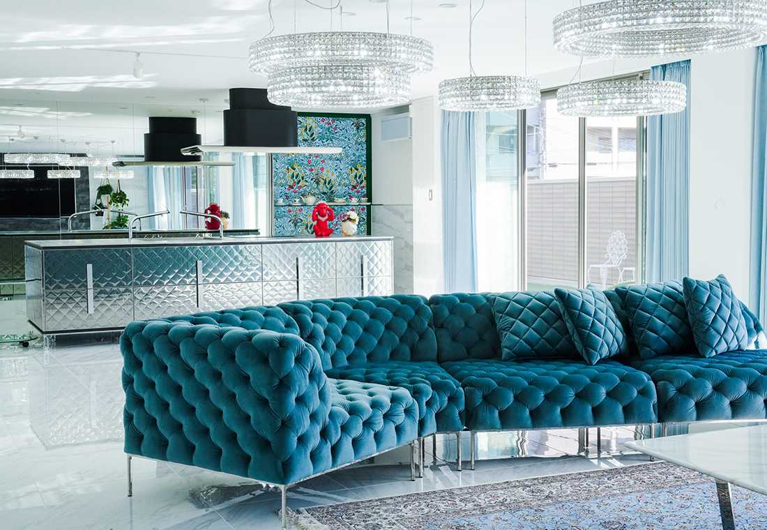 続けてご紹介するのは、当初は白色をテーマにインテリアコーディネートをお考えいただいていたお客様でしたが、ショールームに複数回ご来館いただく中で、家具を一緒に選ぶことの重要性や、色彩を取り入れる楽しさに共感いただき、最終的にブルーグレイ色のソファと鮮やかなモーイカーペットをご採用いただきました。白色を基調とした空間に、アクセントとなるソファとカーペットが映え、ラグジュアリーな雰囲気に仕上がりました。
