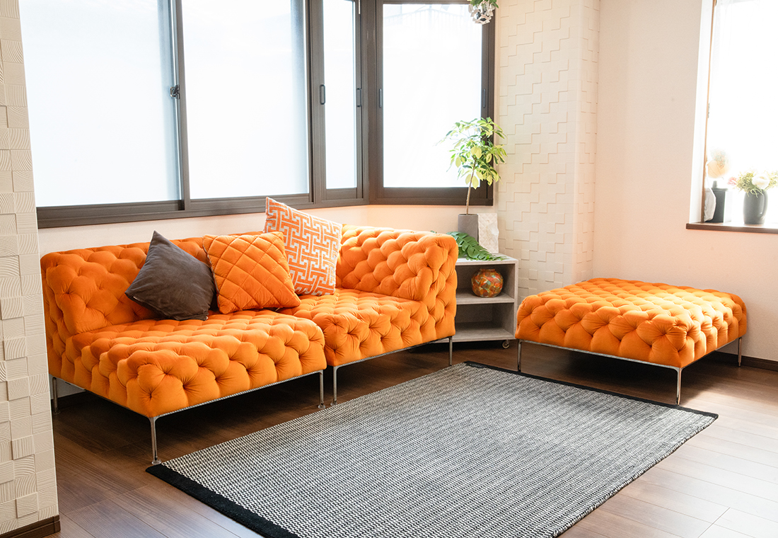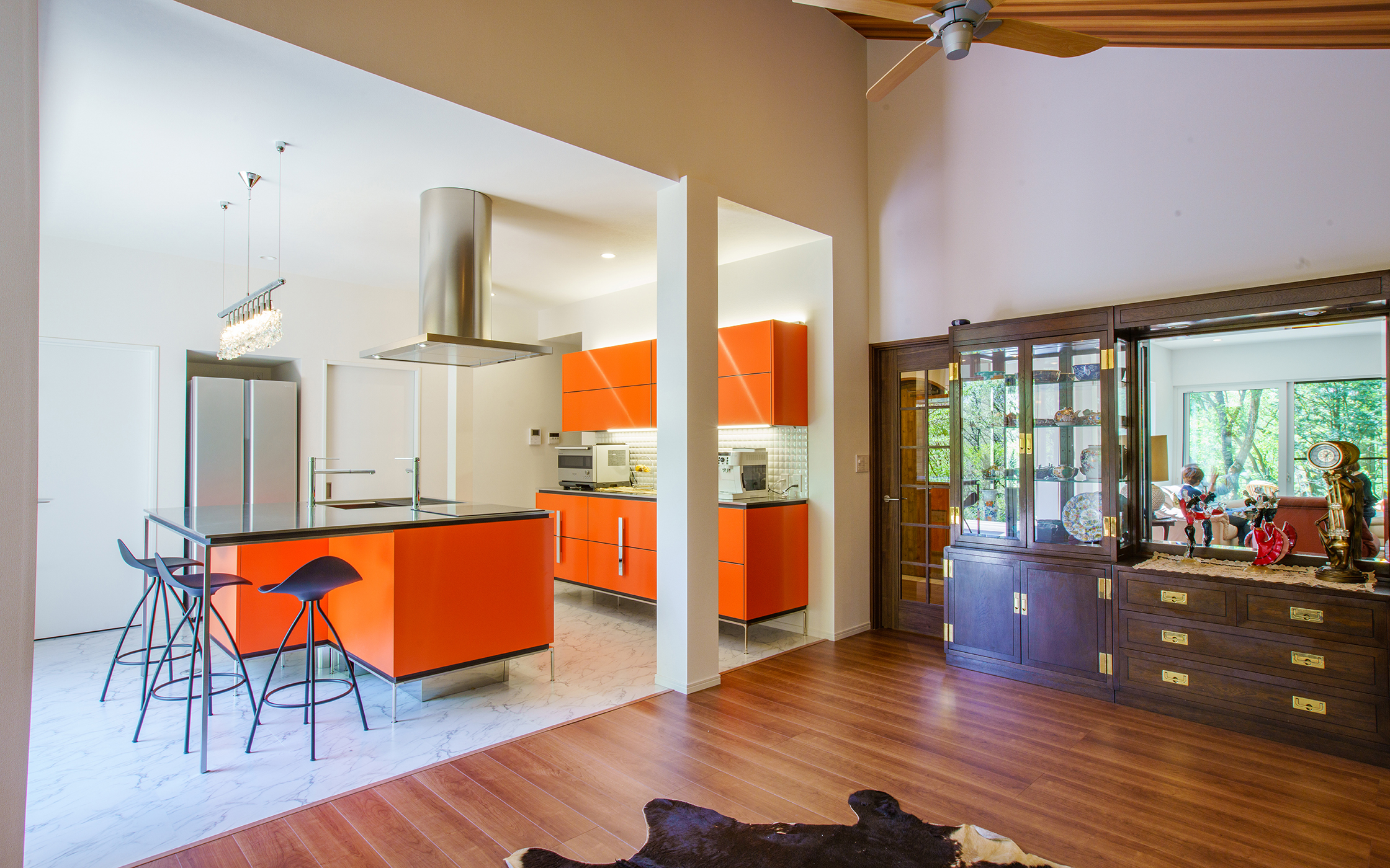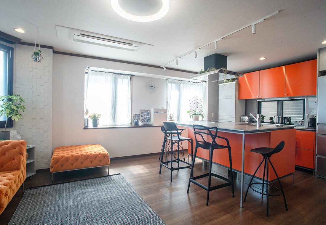 トータルコーディネートを考えるにあたり、カラーをテーマにインテリアコーディネートを計画するのもおすすめです。紹介する事例は、ショールームで一目惚れされたオレンジのキッチンを中心に家具をコーディネートされたリフォーム実例です。