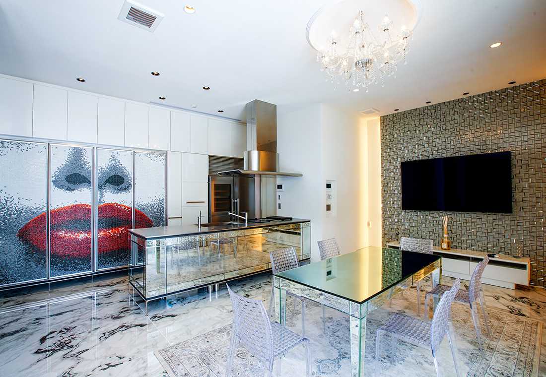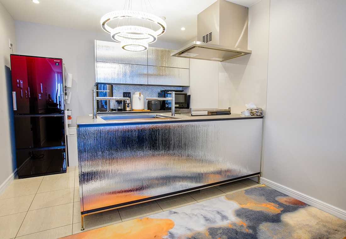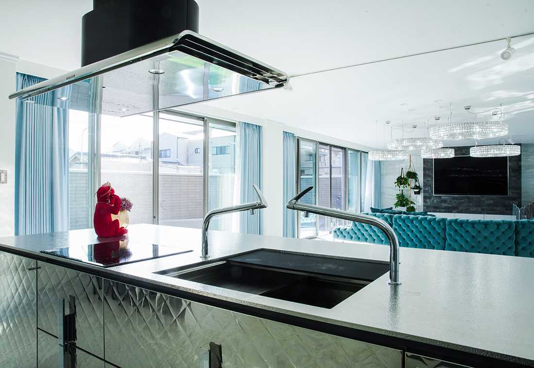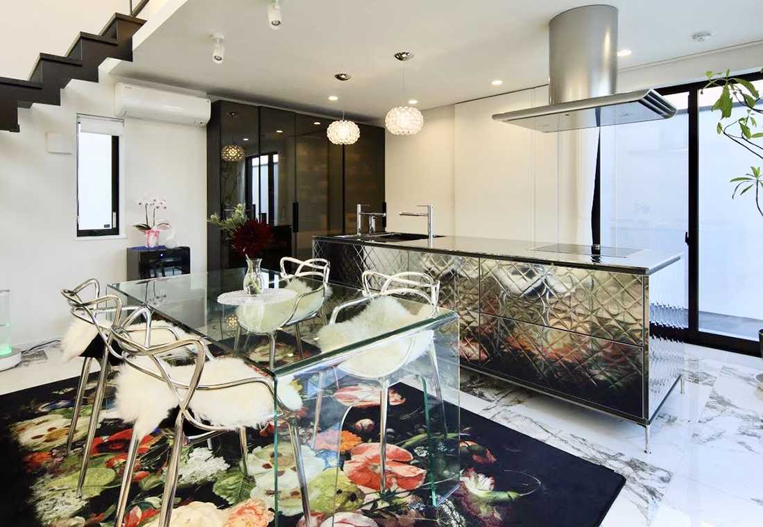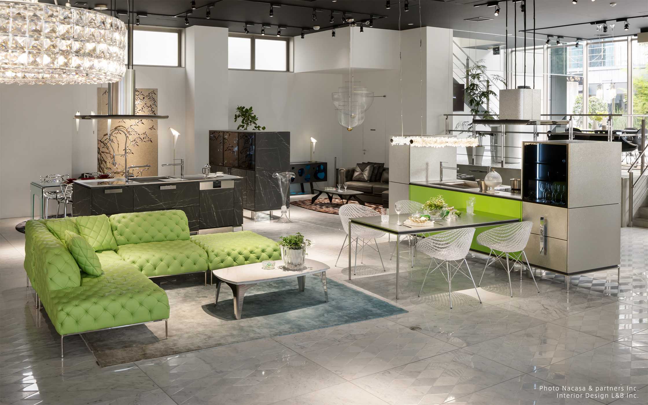 キッチンとダイニングのデザインを統一することで、五感を刺激する感度の高いトータルコーディネートを実践された事例をご紹介します。当初、ダイニングテーブルを目的にショールームにご来館されたお客様は、そのテーブルに合わせて、チェアやソファ、収納を選択しました。さらに、テーマを揃えて、テーブルと同じイタリア・ヴェネツィアのガラス工房でハンドメイドで製作されているキッチンを選択されました。トーヨーキッチンスタイルのショールームでは、キッチンとインテリアをコーディネートした空間展示が行われているため、住まいのイメージを湧かせながら、キッチンとインテリアを選ぶことができます。