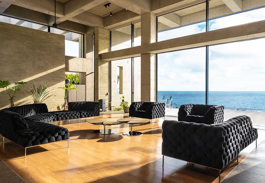 まず最初にご紹介する実例は、眺望が素晴らしいロケーションの中での過ごし方をテーマに新築された住宅です。ソファの形や配置については、計画当初から決めており、LDKで過ごす際にご家族の視線が自然と交わるようなキッチンとダイニングの配置を考慮し、存在感がありながらもスムーズな動線が描ける家具の配置を念頭に計画が進められました。