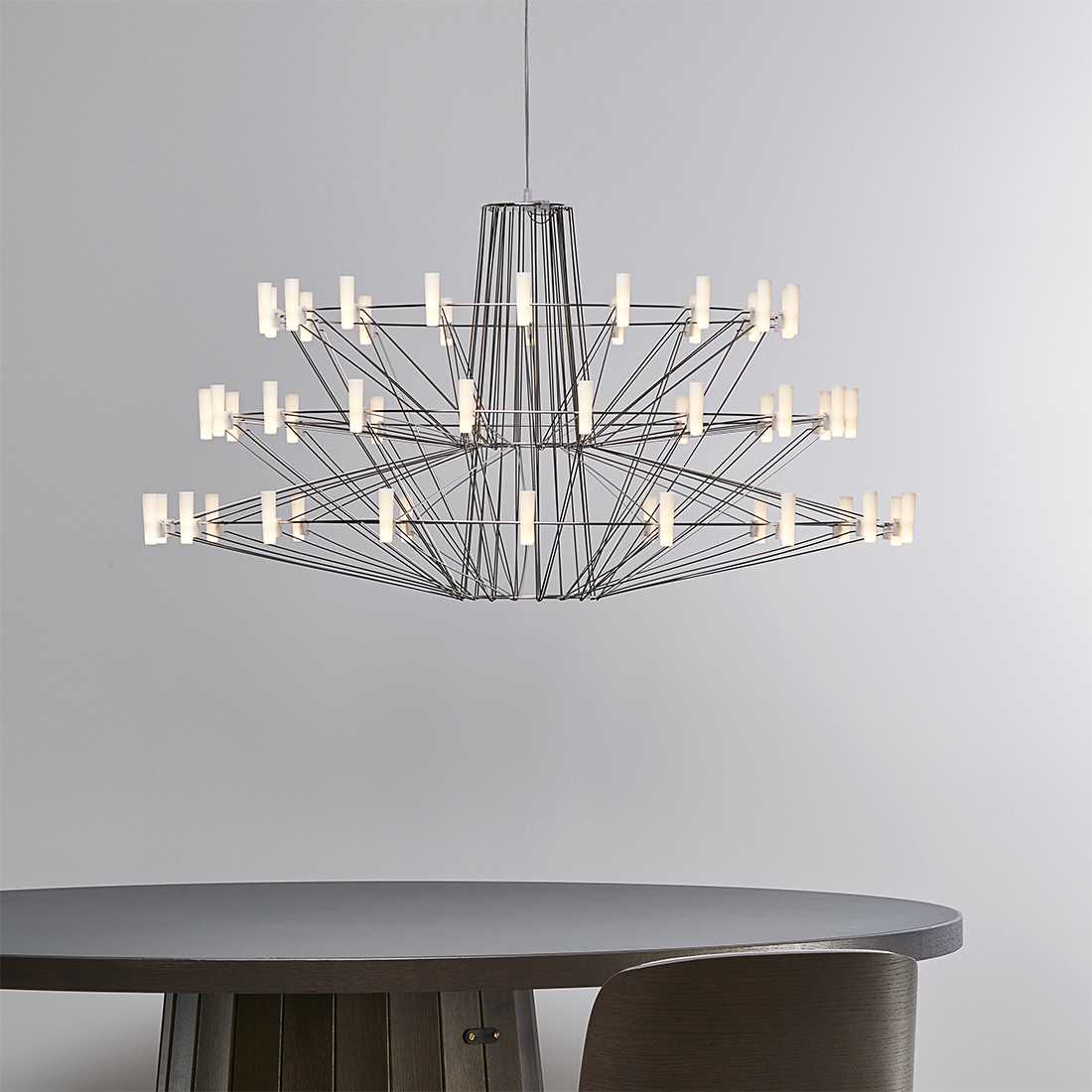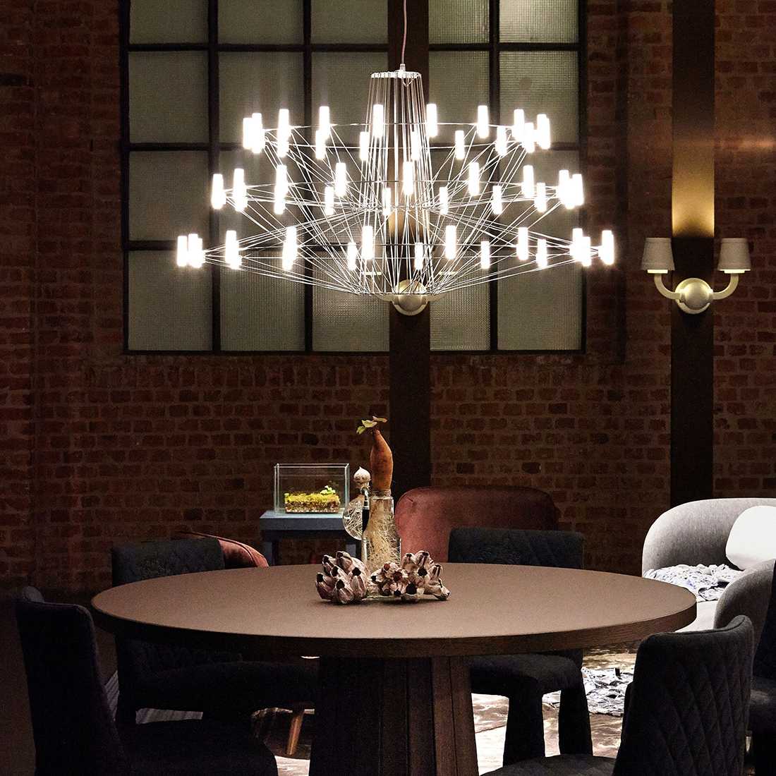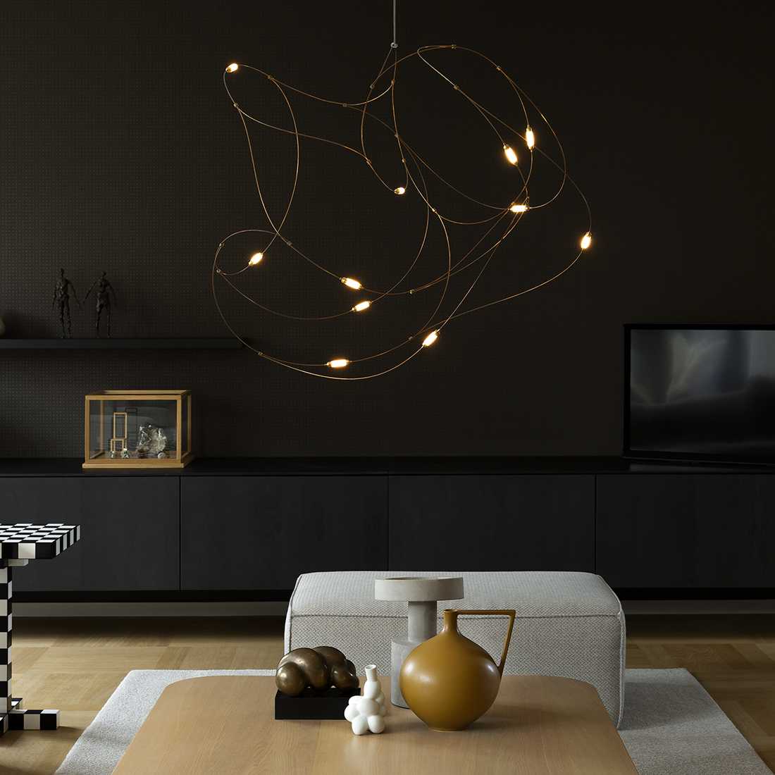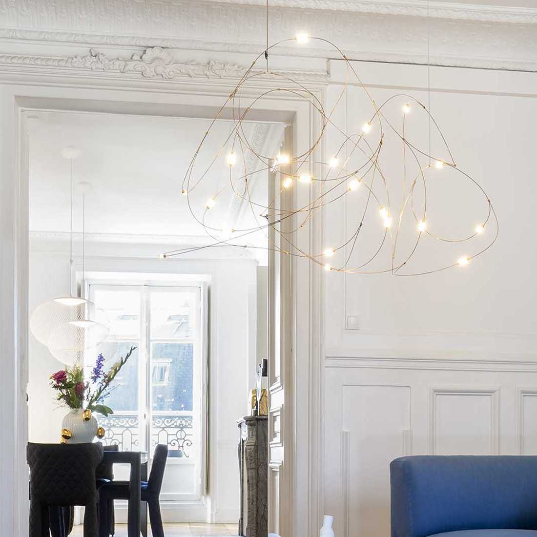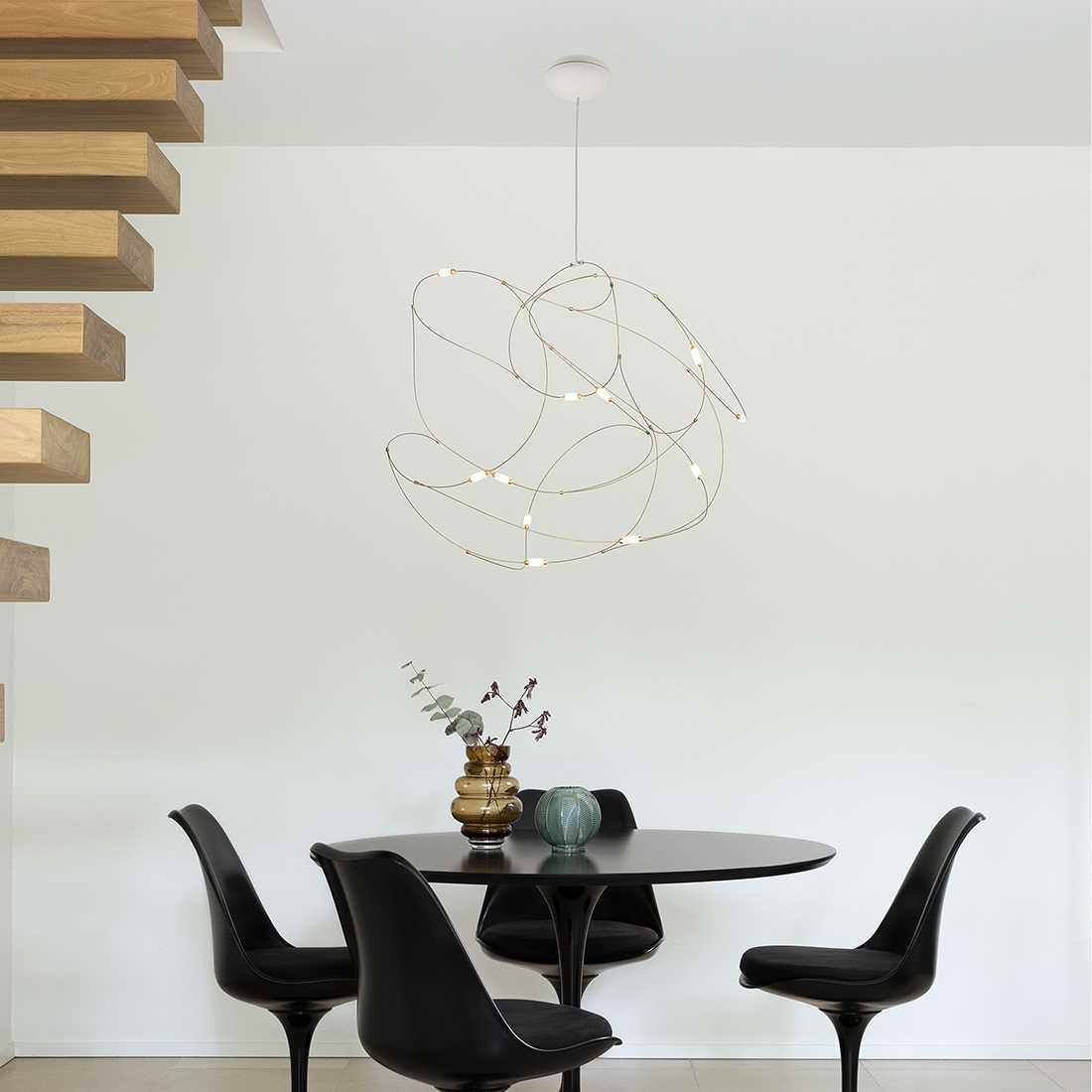 全体の印象は華やかで装飾的でありつつも、無駄な部分が全く無いミニマルな一面も持ち合わせているので、どんな空間にも合わせやすい照明です。特に人が集まるリビングやダイニングなどに最適で、目線の高さに吊っても、ワイヤー構造のため見通しがよく、圧迫感なく食事や会話を楽しむことができます。