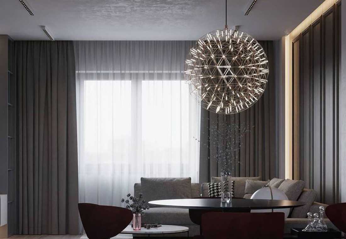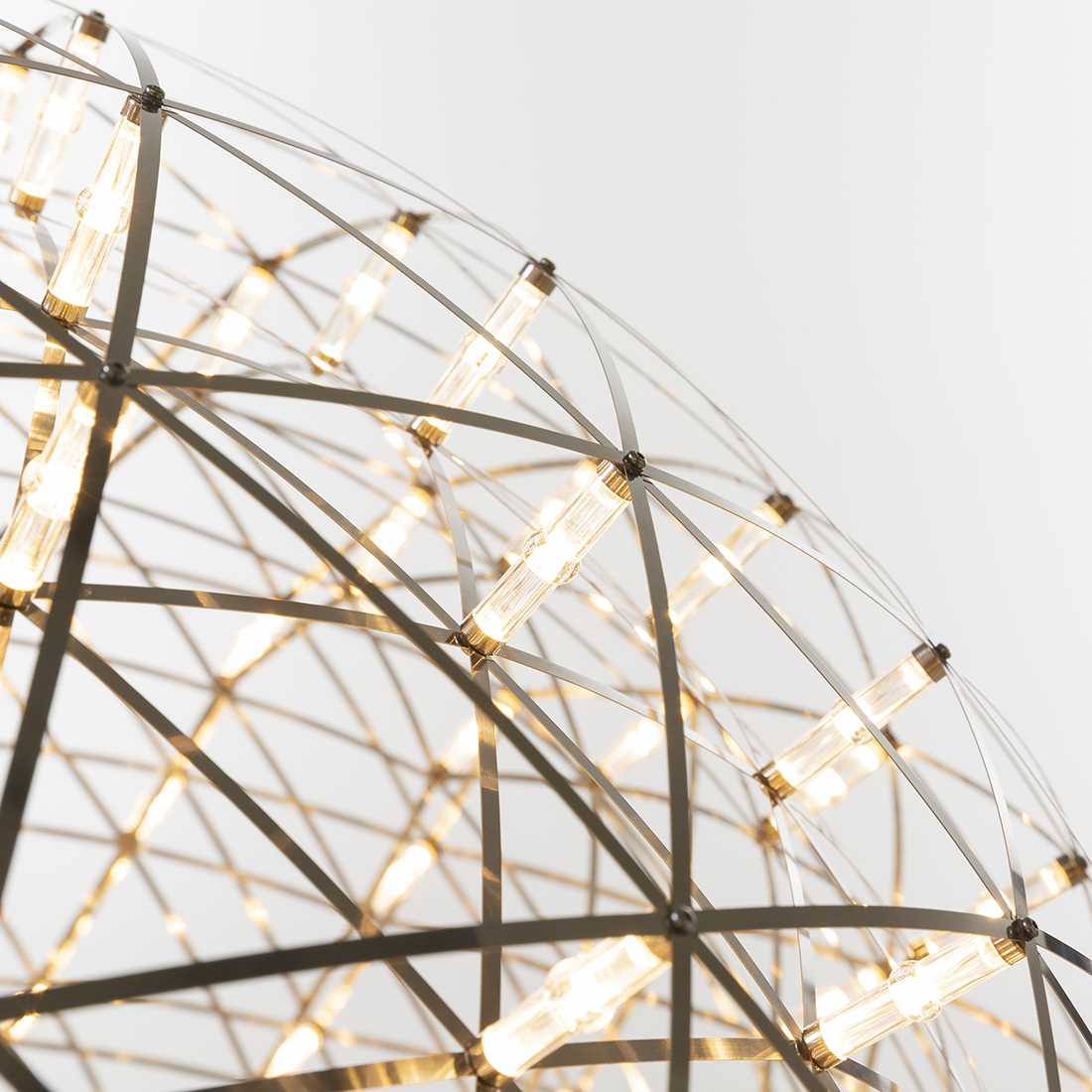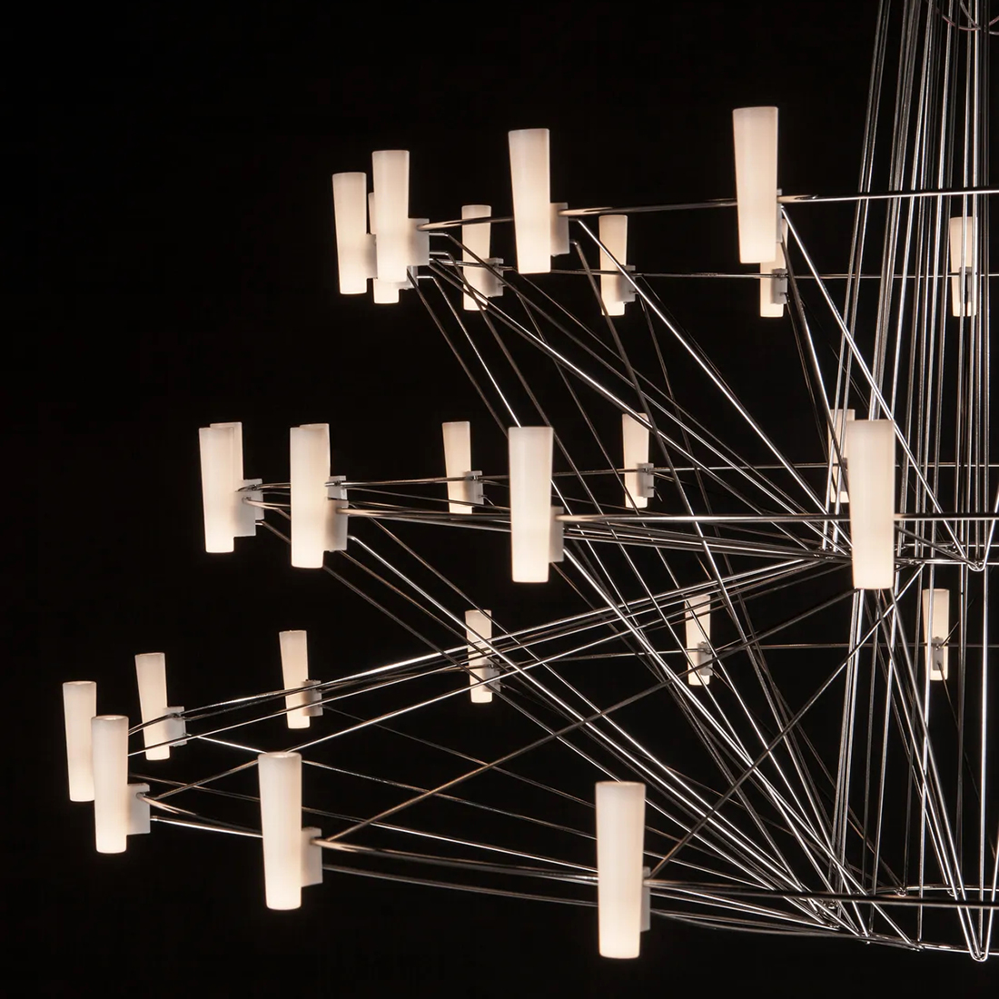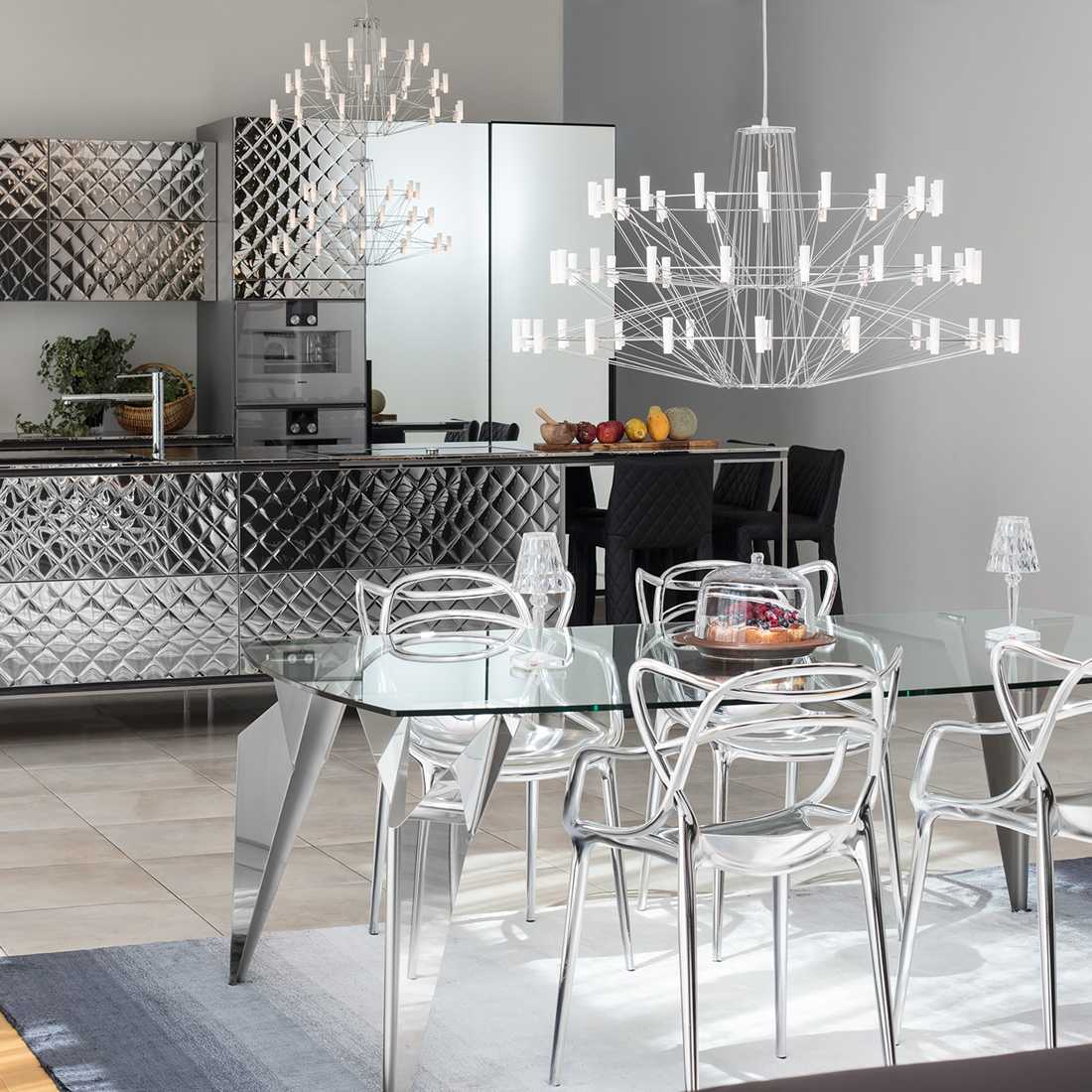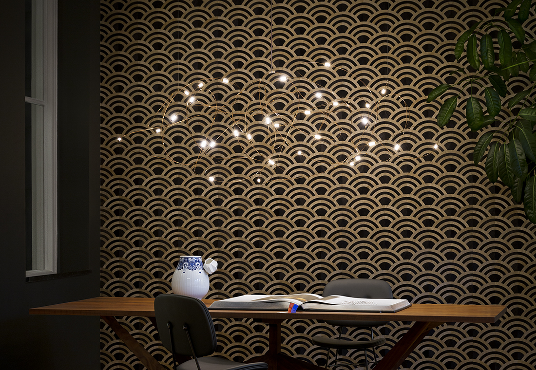全体の印象は華やかで装飾的でありつつも、無駄な部分が全く無いミニマルな一面も持ち合わせているので、どんな空間にも合わせやすい照明です。特に人が集まるリビングやダイニングなどに最適で、目線の高さに吊っても、ワイヤー構造のため見通しがよく、圧迫感なく食事や会話を楽しむことができます。