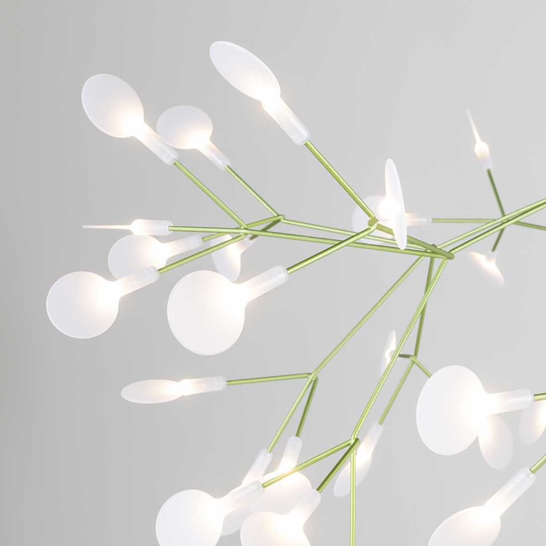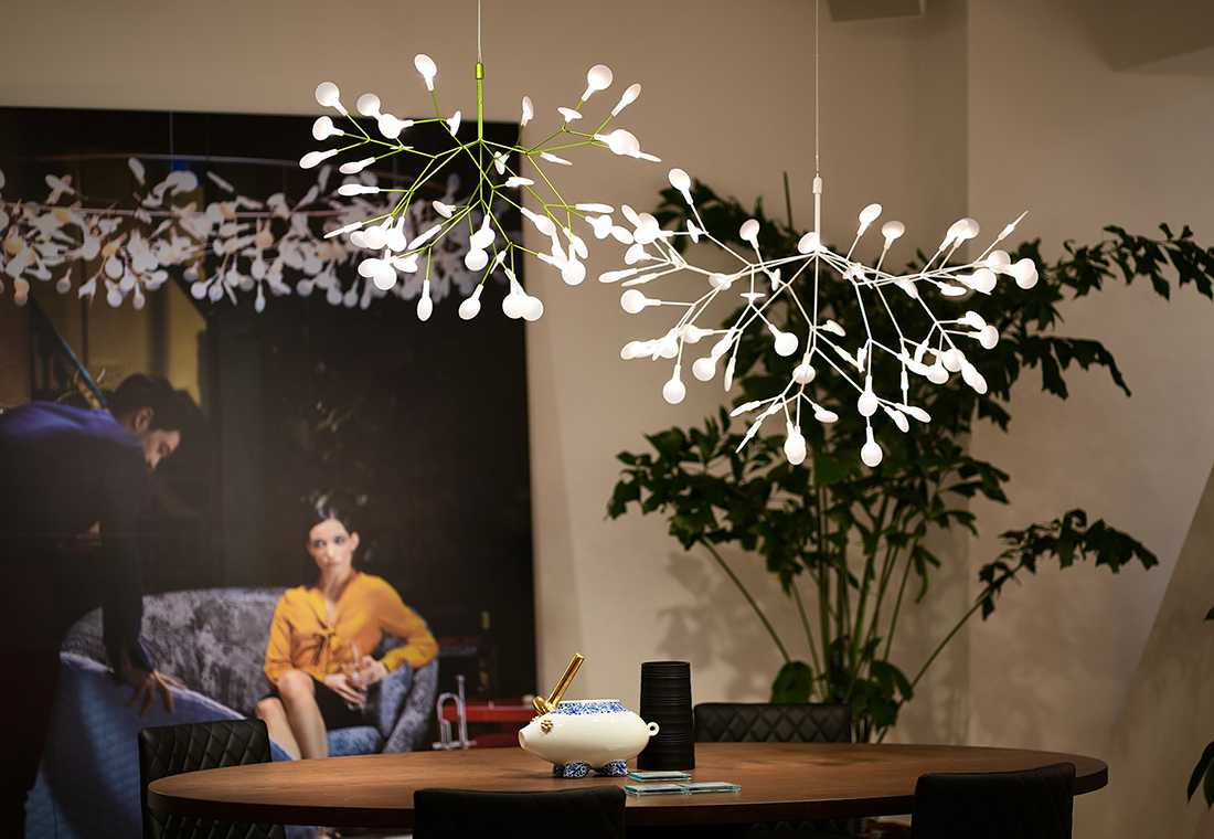 「ヘラクレウム」は実在する植物をモチーフにした照明です。LEDの花弁を支える枝には、moooiの特許技術「エレクトロサンドウィッチ」が用いられており、最先端テクノロジーにより配線のないデザインを実現しました。大きなサイズでも抜け感があるため、テーブル上やリビングで、視線の高さに大胆に吊ることができます。
