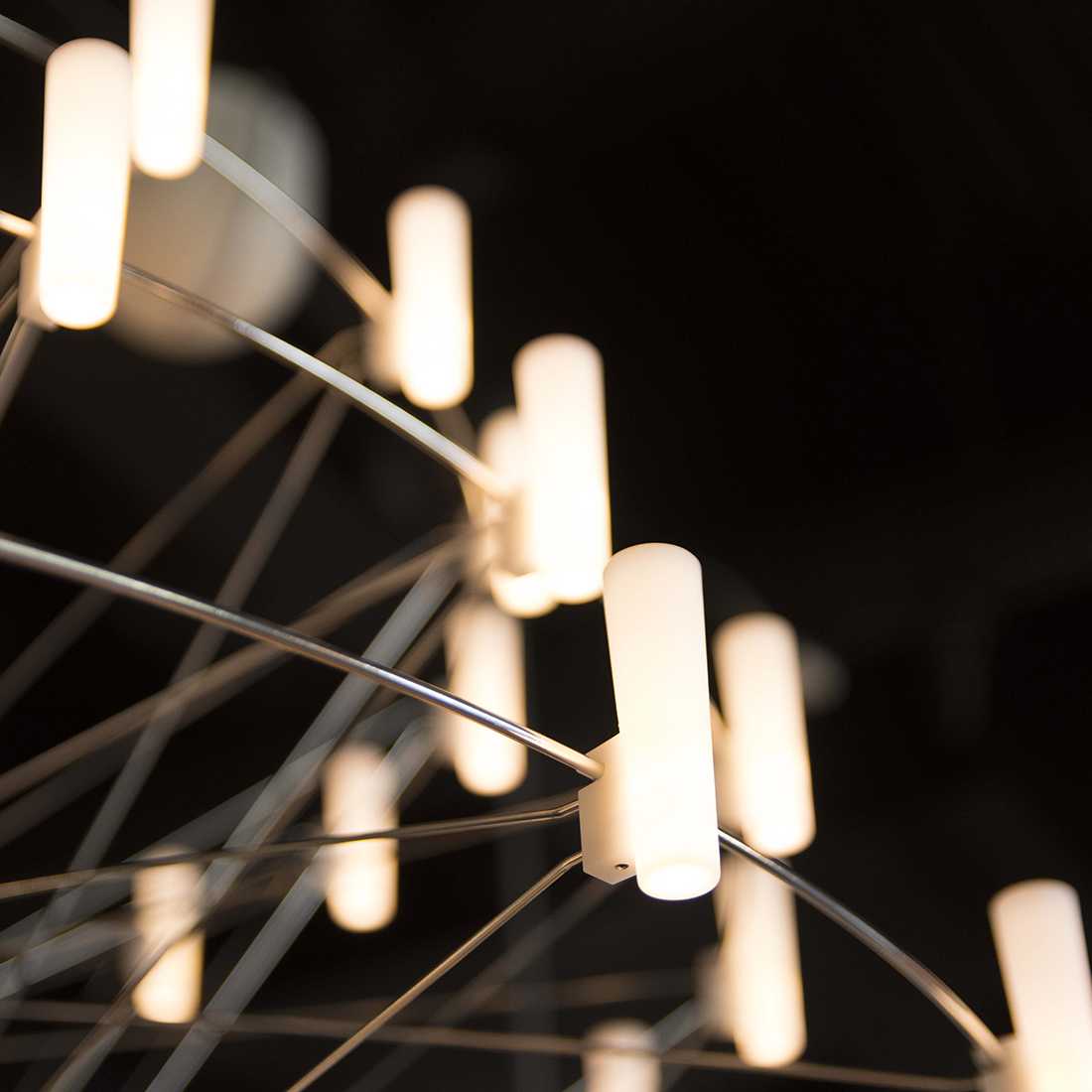 「フロックオブライト」は、ワイヤー上にランダムに配置されたLEDの幻想的な灯りが、夜空を自由に飛び交うホタルを思わせるような照明です。空間を演出する光の彫刻のようなデザインで優しい光で空間を灯します。