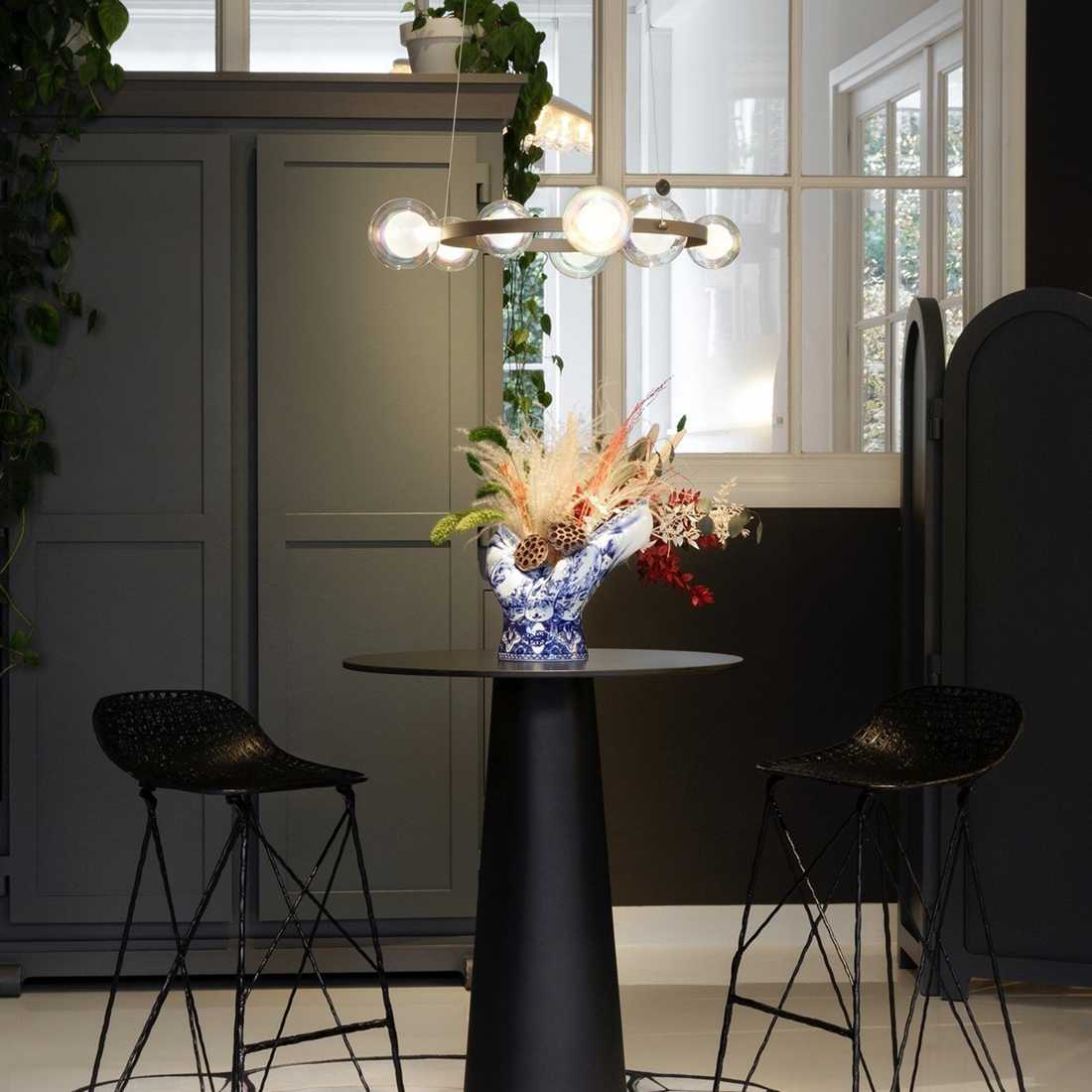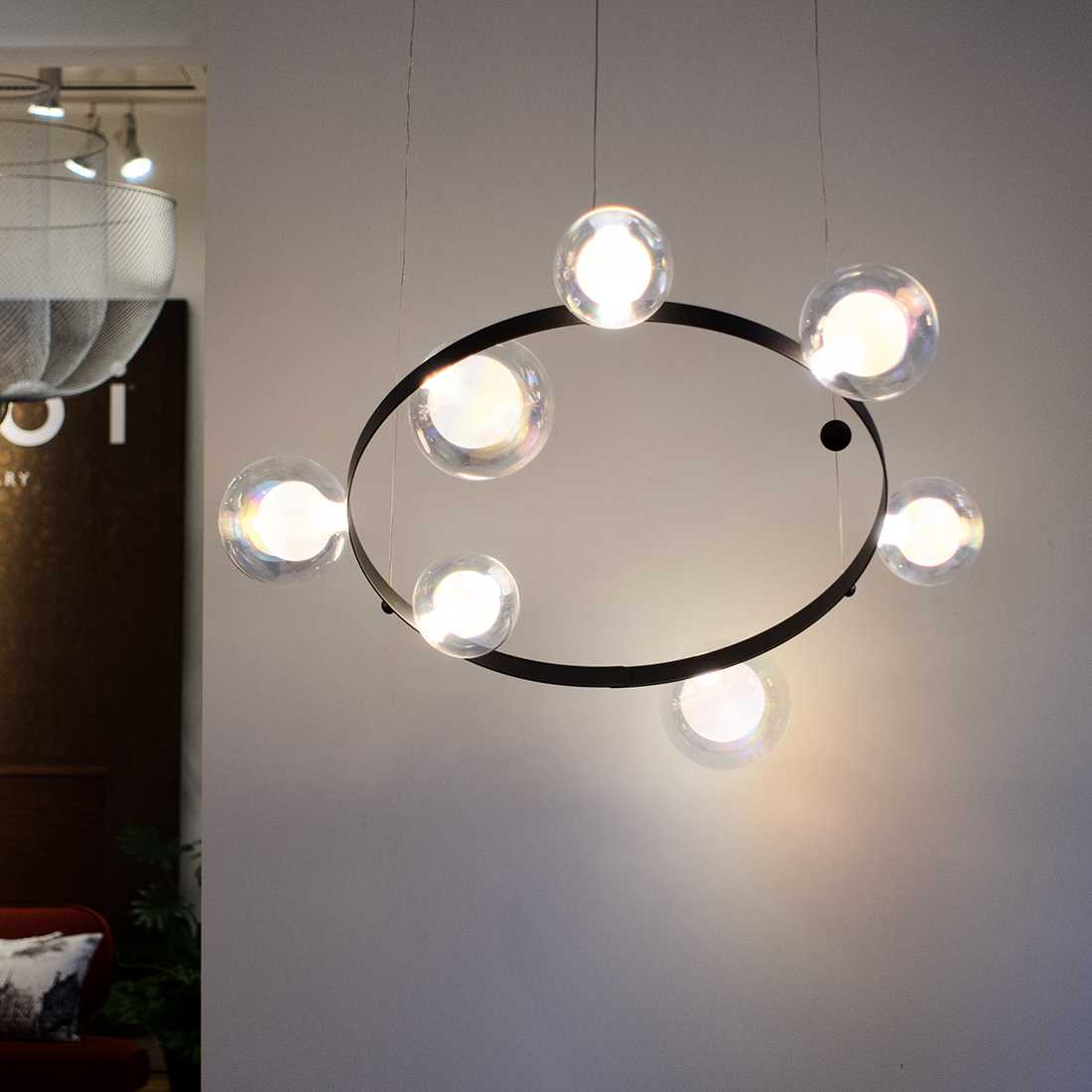 「ハブルバブル」はシャボン玉をモチーフにしたあかりの照明です。リング上のガラス製LEDバブルへの電力供給には、moooi独自のエレクトロサンドウイッチの最新技術が用いられています。この革新的な技術により、配線のないスリムなデザインが実現し、バブルのあかりがまるで宙に浮遊しているかのような幻想的な情景を生みます。