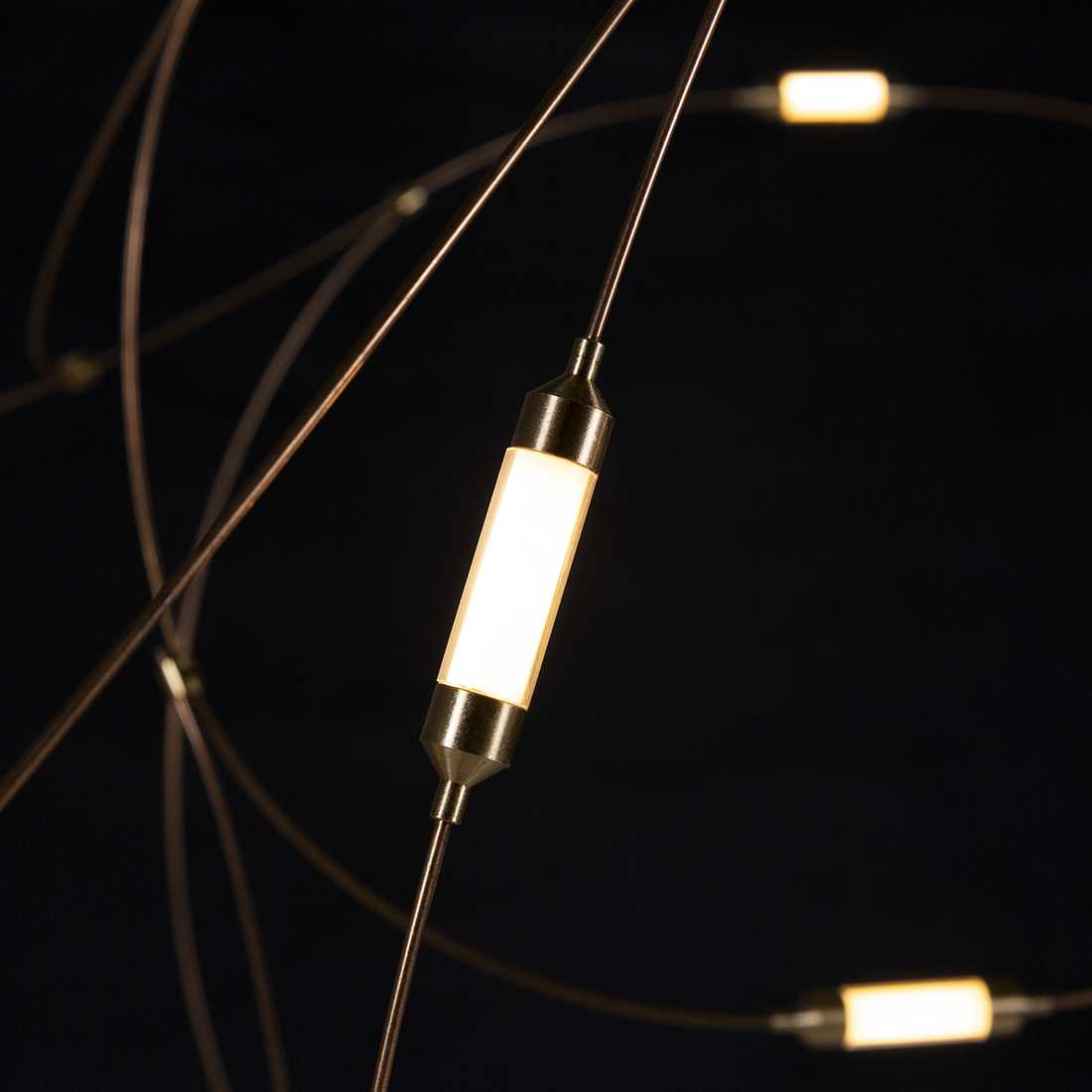 「コッペリア」は最新のLED技術を用いて、新しいシャンデリアのかたちを表現した照明です。本体やアームを構成する金属のワイヤー構造そのものが、先端でほのかにろうそくのように灯る専用のLED光源に電力を供給する構造で、日本人デザイナー、三宅有洋氏が「今までにないものや新しい何かができないか」を追求することで誕生しました。