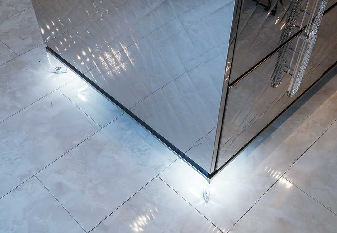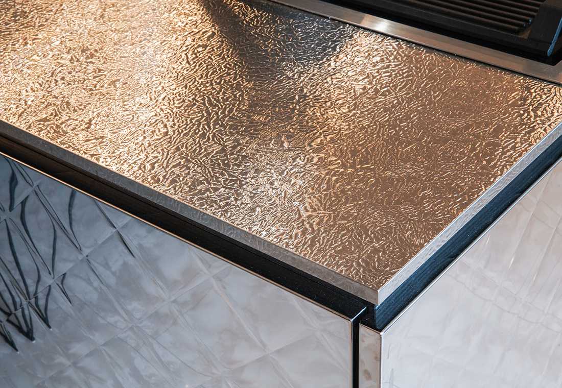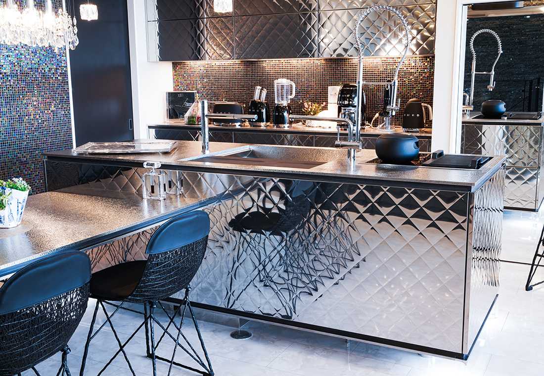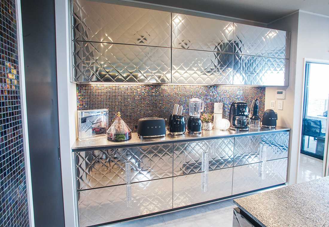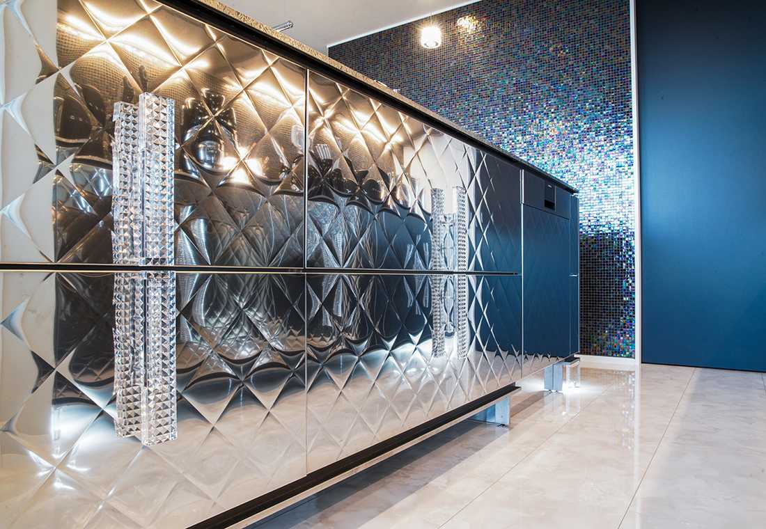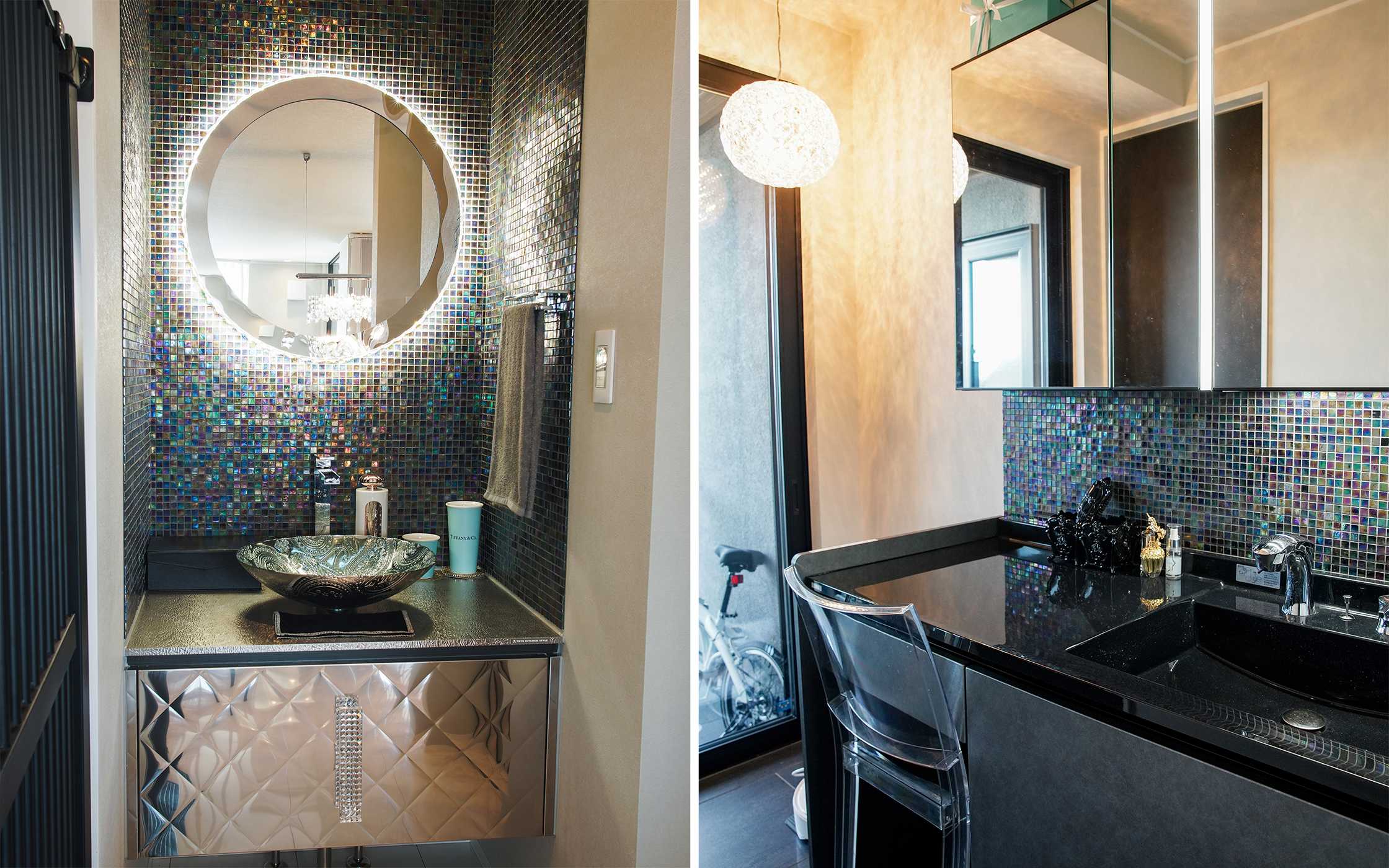 LDKそばのパウダールームも洗面台にキルトパターンを用い、壁面にはキッチンと同じヴェネツィアンモザイクタイルを採用。照明の光を受け、魅惑的な輝きを放っています。