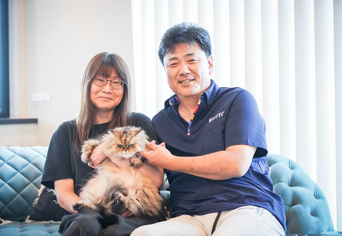 趣味は「漫画を読むこと」だと話すご主人と、「美術鑑賞が好き」という奥様。同い年のお二人は、小学生の頃からのご近所同士で学校も同じ。中学生の頃からおつきあいをしていたという仲のいいご夫妻は、ともにインテリアに関心が高く、お互い好みも似ているため、もの選びで意見が割れることはあまりないのだとか。愛猫の嫁子ちゃんも「集ソファ」がお気に入り。