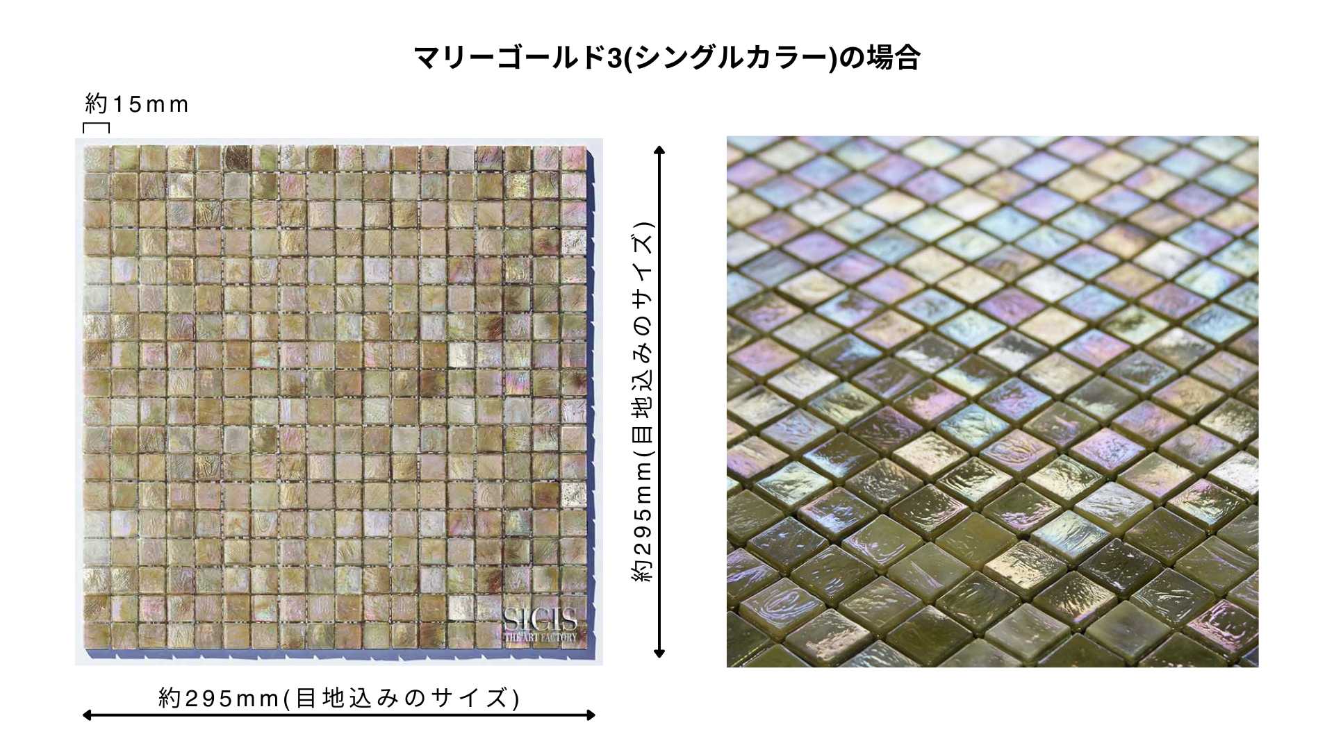 シチスのモザイクタイルは、シングルカラーの場合、15mmのチップを縦横18個ずつ並べた約295mm角のシートサイズです。そのシートを壁や床のスペースに合わせて端から貼っていきます。