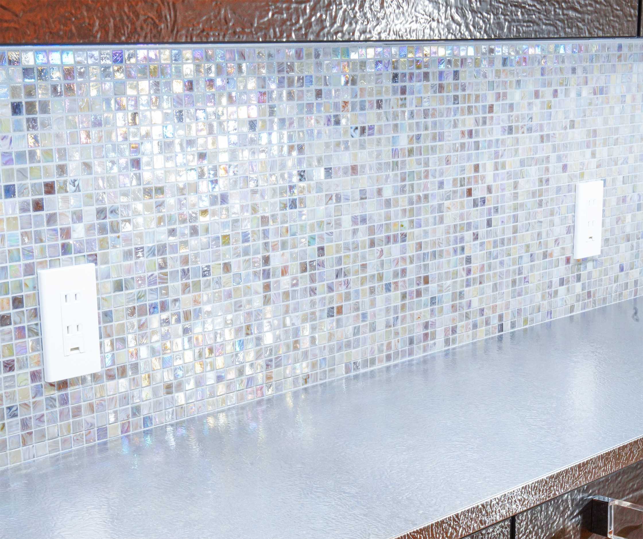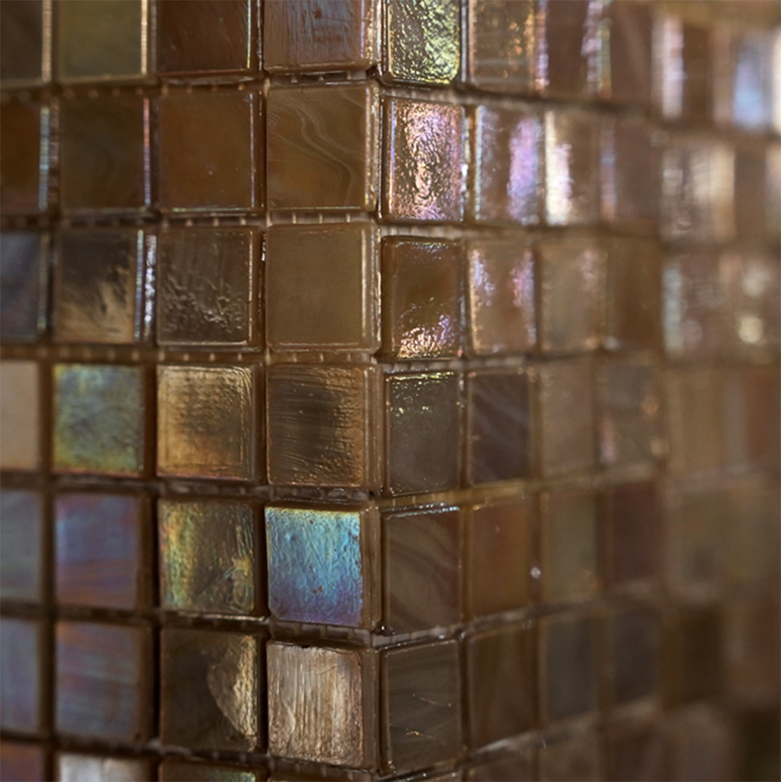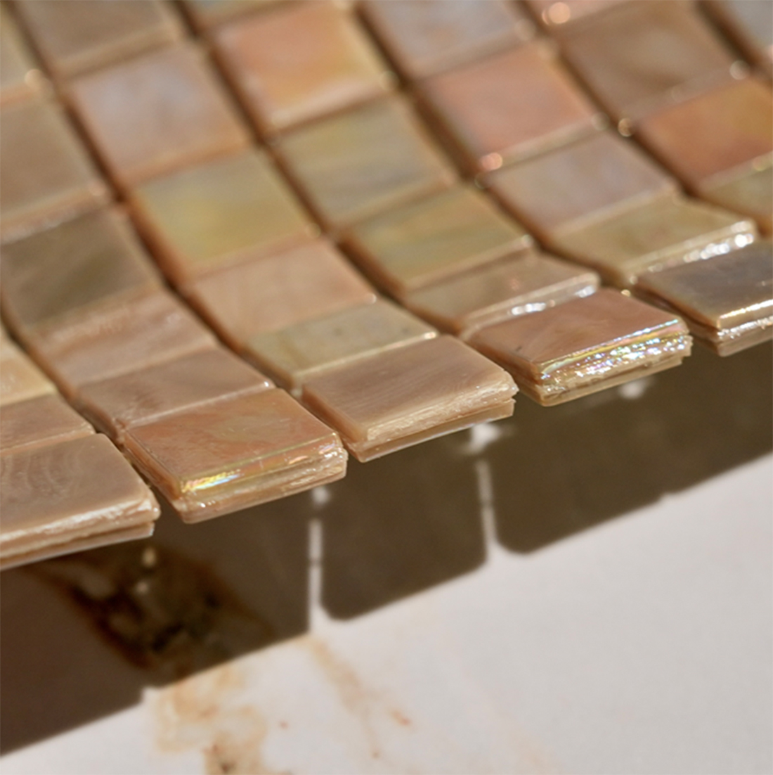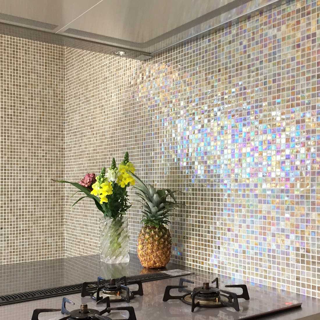 一般的に、モザイクタイルのガラスチップを生産する際は、コストを抑えるために大型ガラスを製造し、それを細かく分断して生産します。しかし、シチスは1チップずつ抽出される工法によって生産しています。また、合わせ構造により耐久性を増し、ローリングを行うことで角を丸く仕上げ、ガラスの鋭利さを取り除いています。そのため、シチスは一般的なガラスモザイクでは実現できない美しい仕上がりを可能にします。