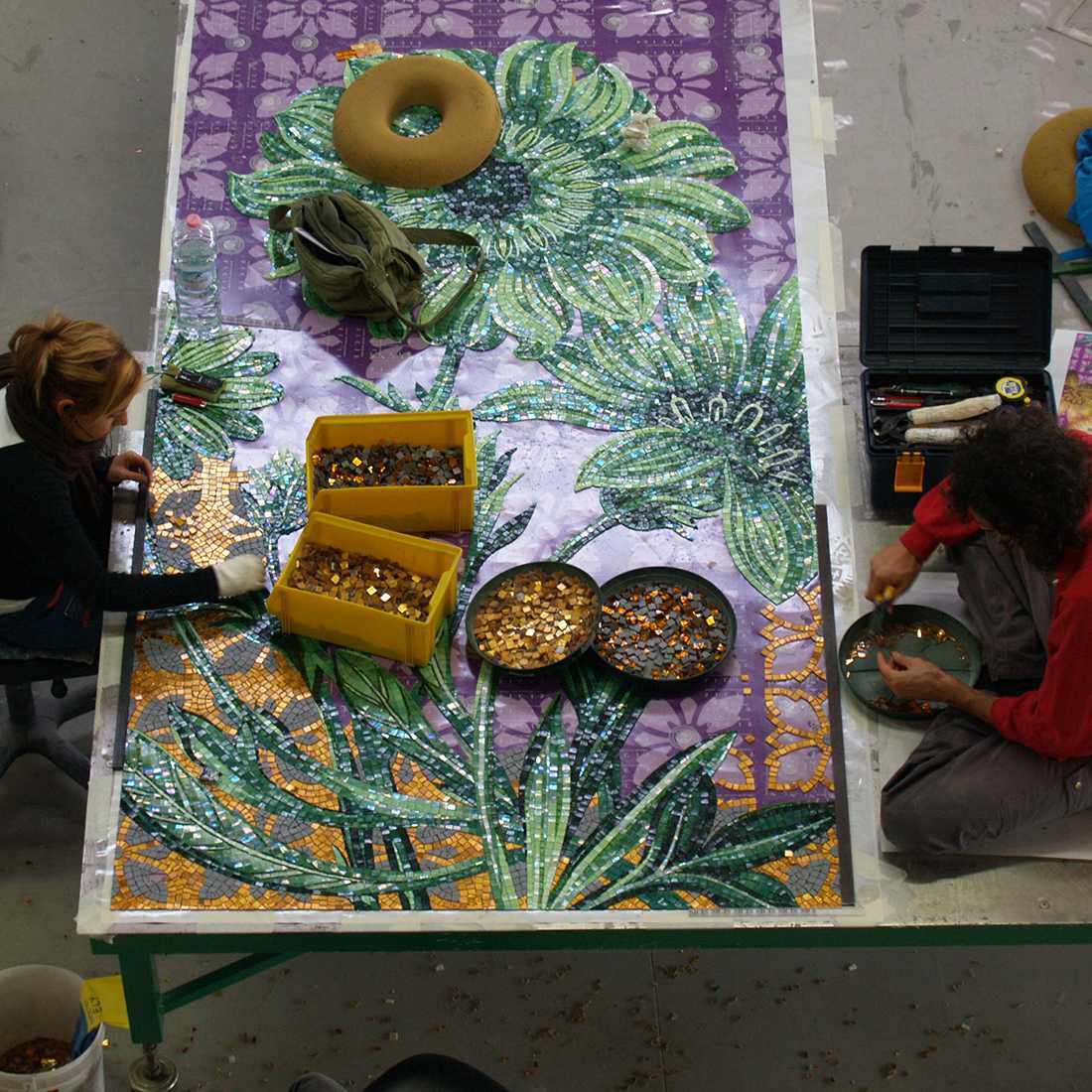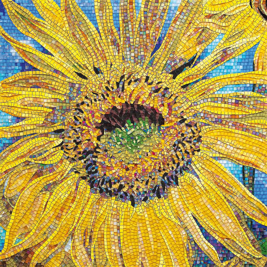 イタリア・ラベンナにあるシチスの工房で熟練したモザイク職人が、吟味したモザイクを1枚1枚手割りして製作。若冲の繊細な筆の動きを再現するため、通常の手割りモザイクよりも細かく貼り合わせを行っています。独特な豊かな色彩をベネツィアンモザイクによって表現する事により、艶と透明感を加え、名作に新たな解釈を与えました。