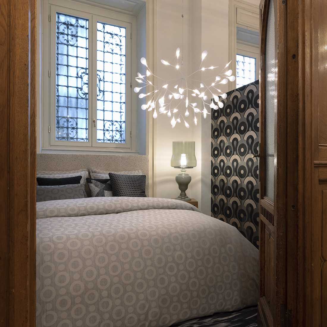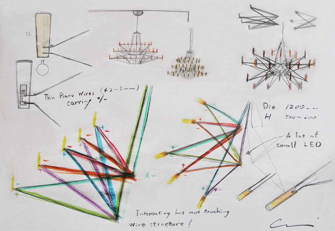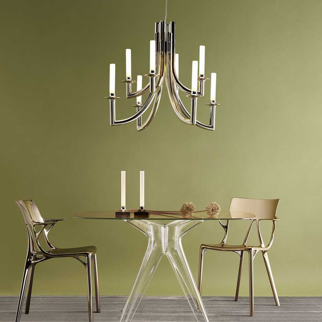 軸を中心に放射状に伸びるアーム、その先端で灯る光源。クラシックなシャンデリアの定義をなぞりつつ、そのすべてが新しく再定義されています。全体の印象は華やかで装飾的でありつつも、無駄な部分が全く無いミニマルな一面も持ち合わせているので、空間に光が浮かぶ、とも言える独特の浮遊感があります。