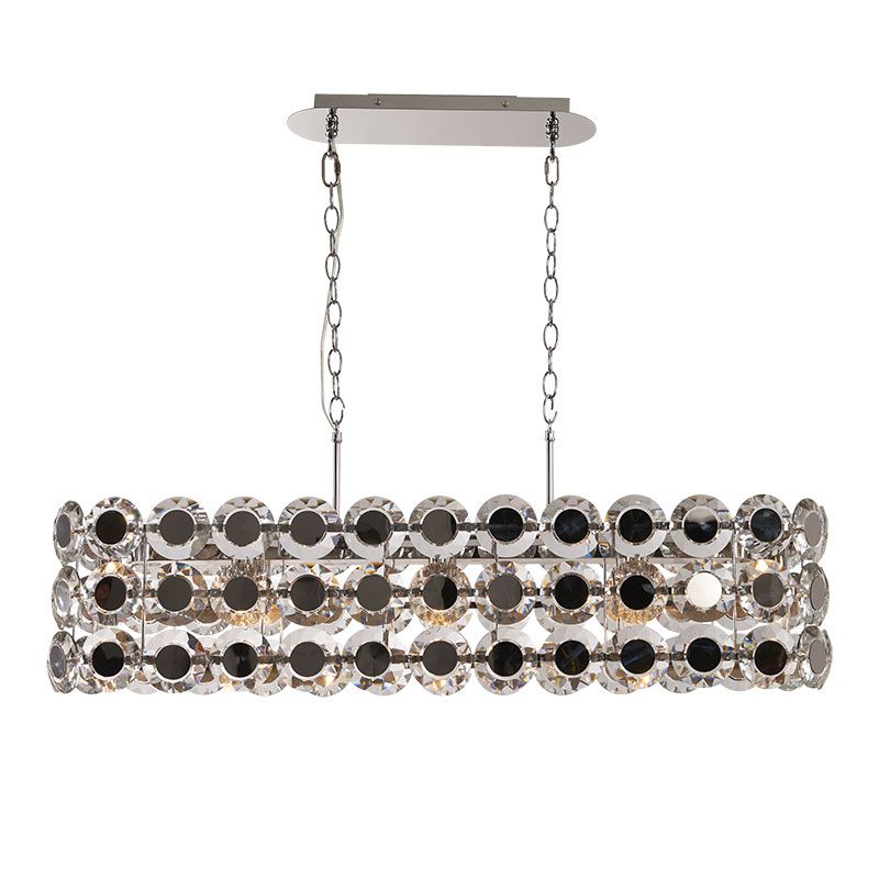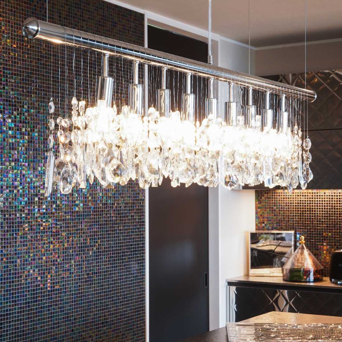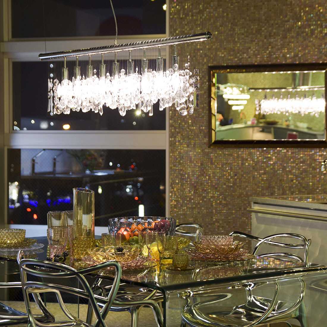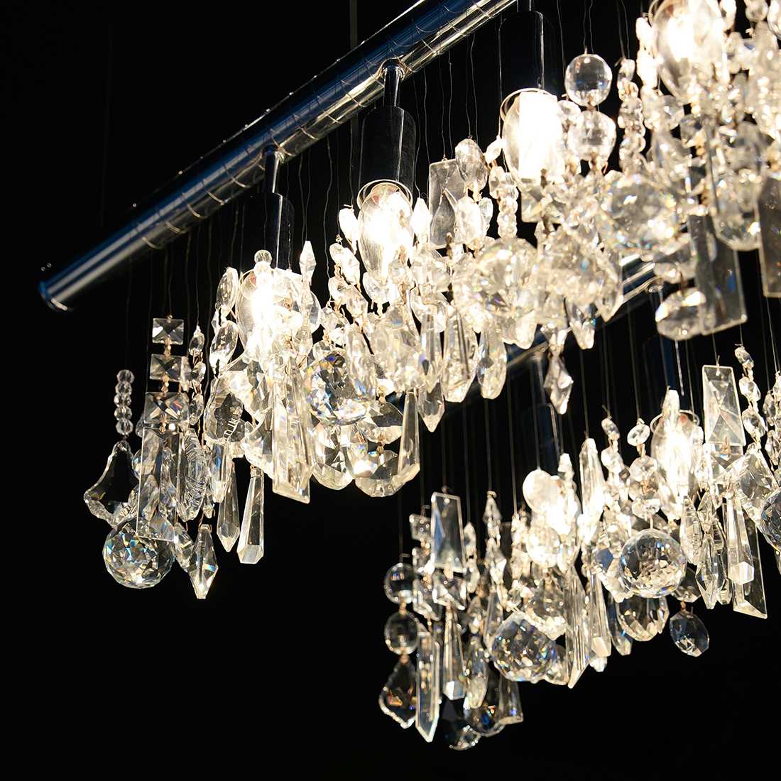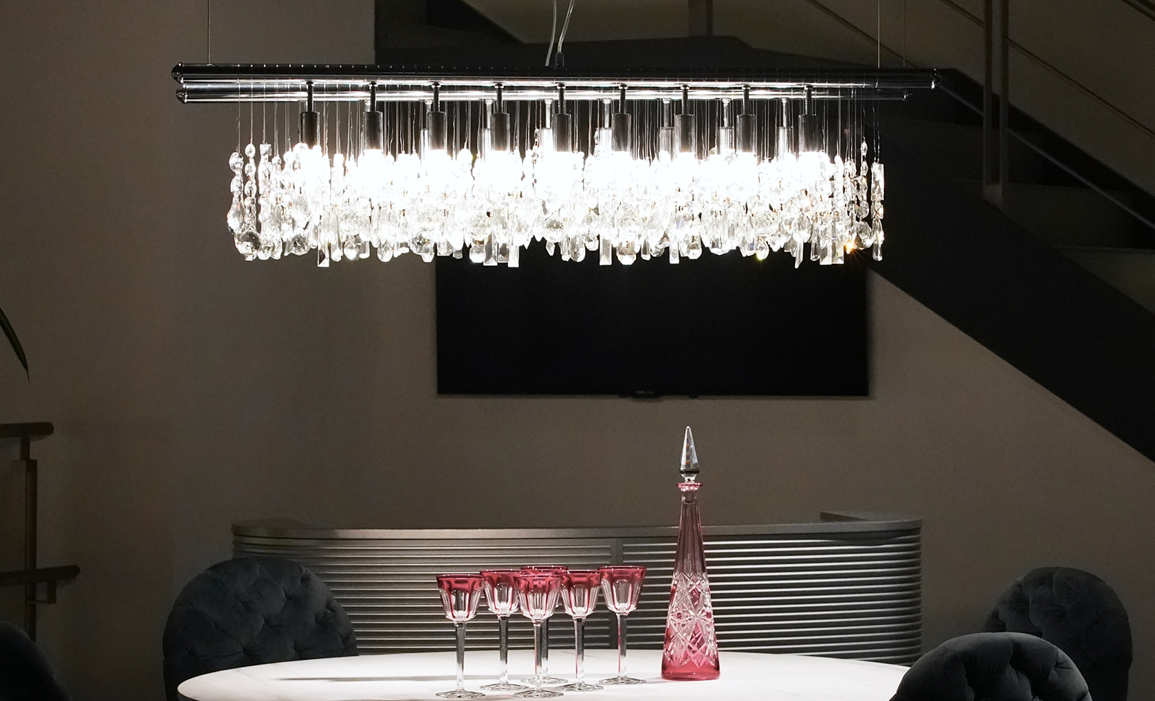 ロングセラーの定番シャンデリア。横に長く伸びたバーに直接オーナメントが配置されたモダンデザインのシャンデリアです。細長い形状なので、キッチンのシンク上部や、ダイニングテーブルともコーディネートしやすく、配置する高さを低めに設定することで、目線の高さでクリスタルの輝きを楽しめます。モダンにもコンサバティブにも幅広いインテリアに組み合わせられることも魅力です。