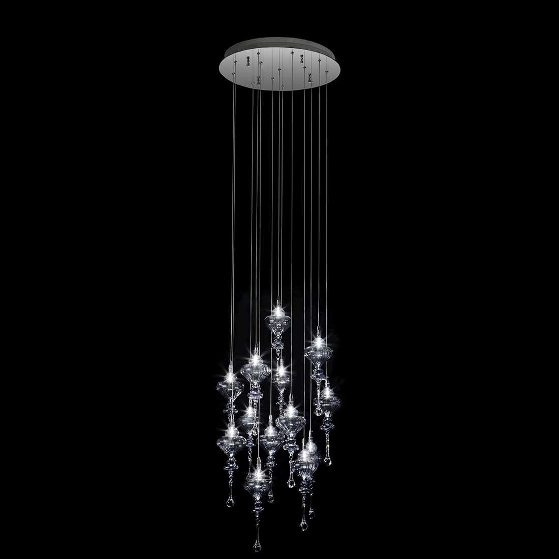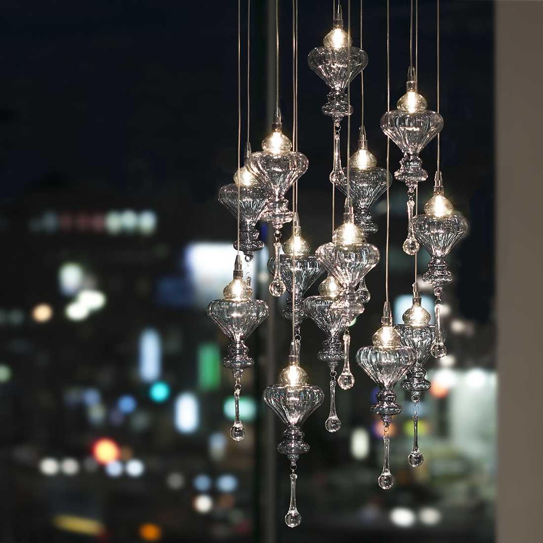 高さをランダムにすることで、オーナメントを様々な角度から見ることができ、ガラスの精細さが際立ちます。チェスのコマのような複雑な形状と、グレイガラスのコンビネーションは上品かつゴージャスです。光源はフロストガラスでつつまれて、柔らかく灯ります。