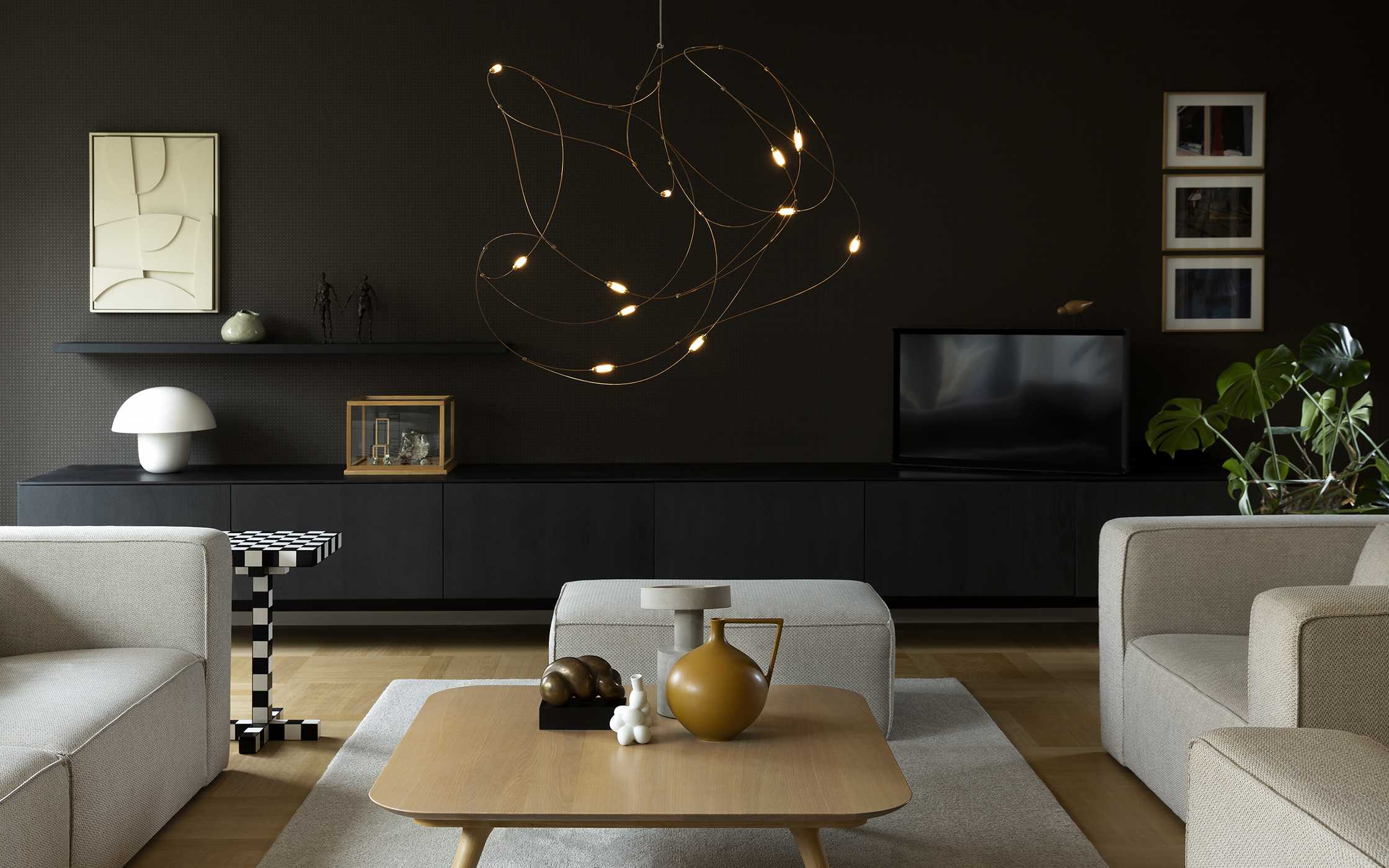 クランカーサテライトのもう一つの魅力は、どんな空間にもフィットする多彩なバリエーション。吹き抜けの大空間にクランカーサテライト23、キッチンにクランカーサテライト3を複数灯、ダイニングにクランカーサテライトV8を使用する等、LDK全体をテーマを揃えてトータルコーディネートすることができます。