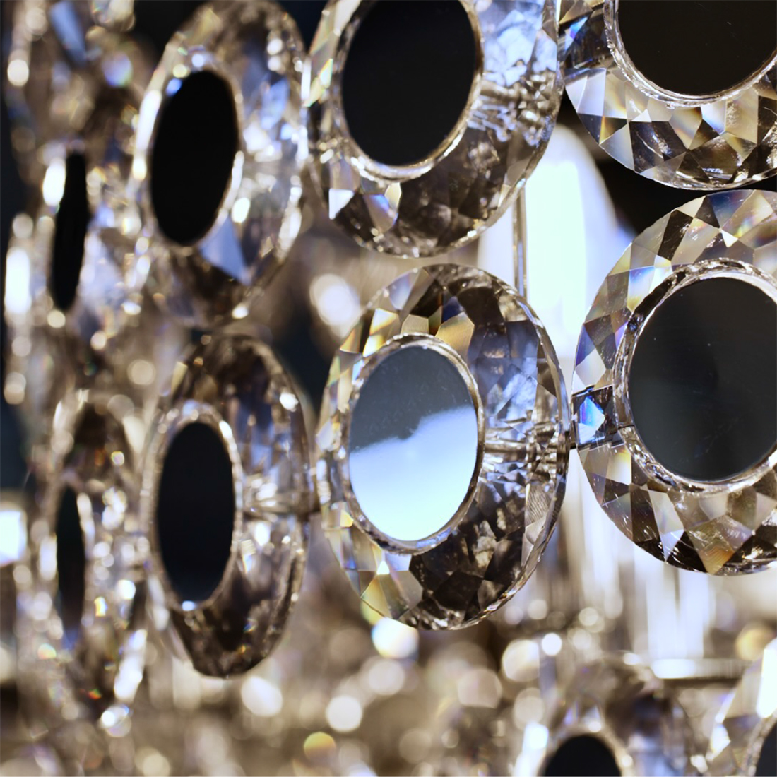 クランカーサテライトは、円形のステンレスミラーの周囲に多面カットを施したクリスタルガラスの装飾が特徴です。