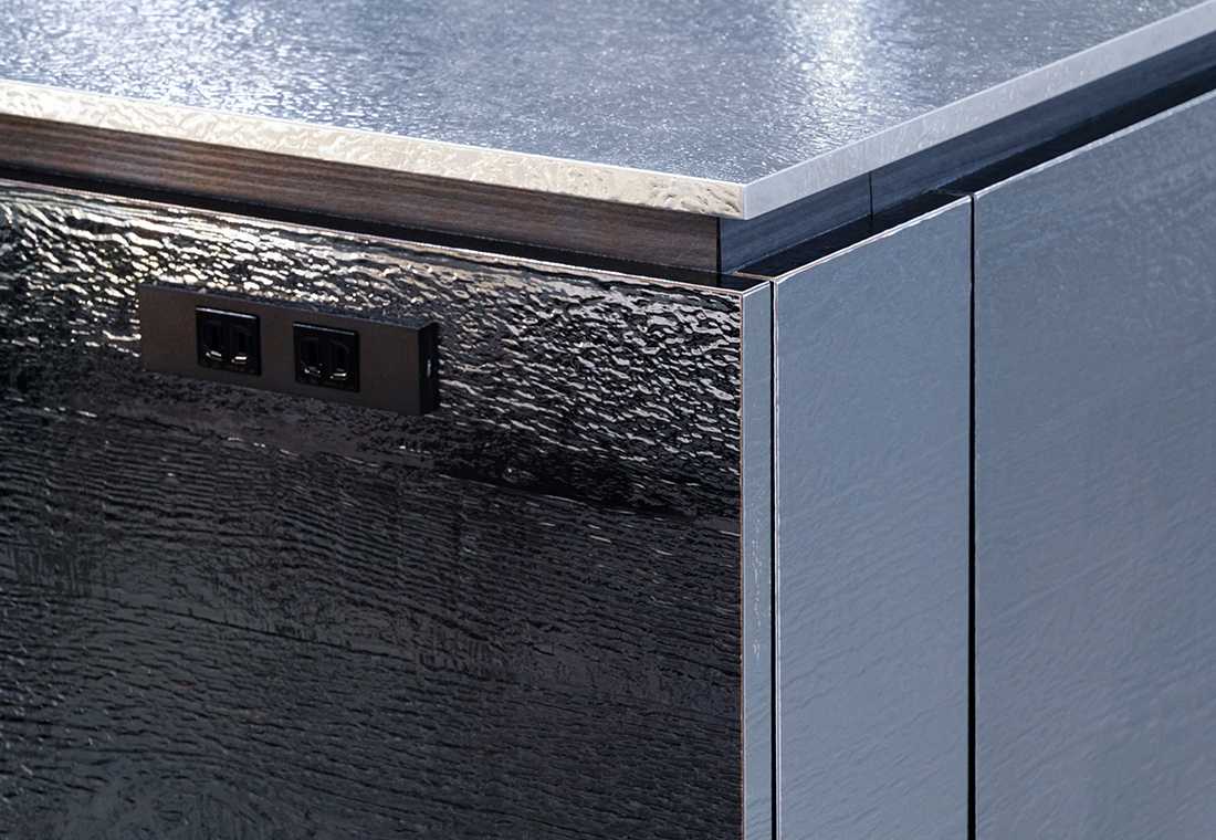 面材には木目とメタリックな質感を併せ持つメタルスモークを、天板はアイスを選び、空間の主役となった「iNO」。側面のコンセント設置も便利なポイント