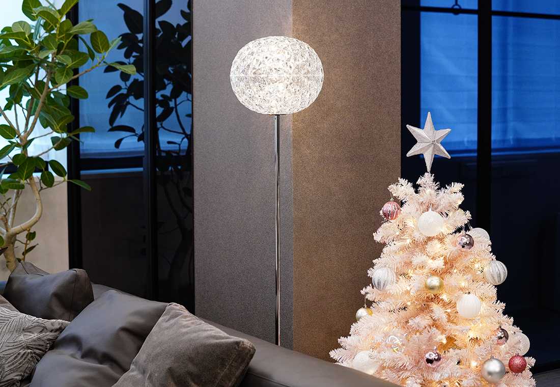 ご主人からの全幅の信頼を受け、リフォーム計画を実施した奥様。趣味はおいしいものを食べることと、つくること。家が新しくなってからは、リビングでコーヒーを飲みながら、部屋を眺める時間も心地いいと話す。「先日、夜に部屋の照明を消してカルテルの『プラネット』(クリスマスツリーのそばにあるフロアライト)だけをつけたら、天井に水面のような光が現れて! その美しさに感動しました」。