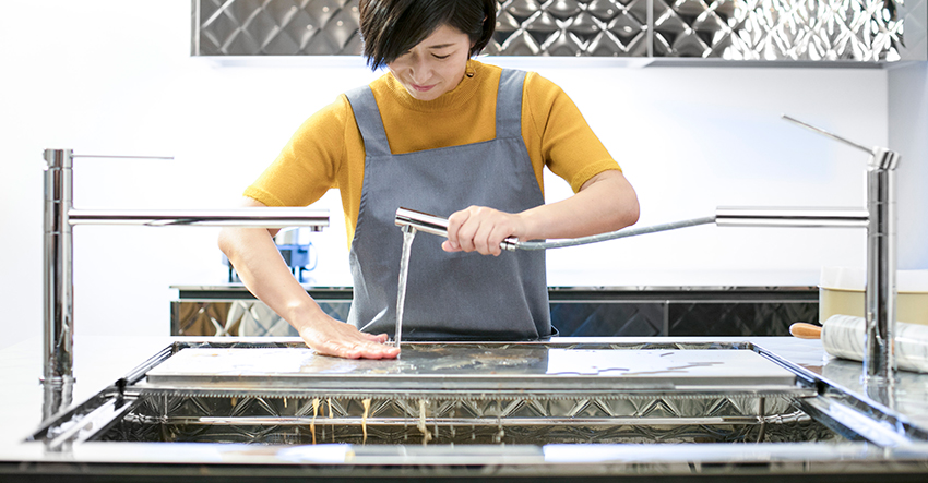 トーヨーキッチンスタイルのキッチンは、シンクを立体的にフル活用することによって、シンク内での調理を実現しました。