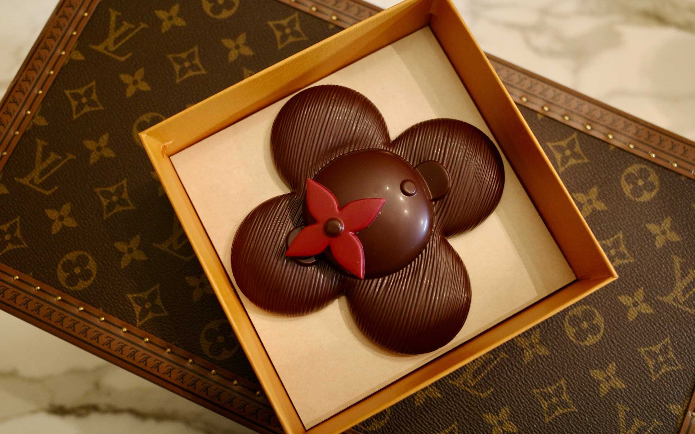 入り口には巨大な”ヴィヴィエンヌちゃん”。そして店内は、壁一面にルイヴィトンのトランクが積み上げられているデザインで、その一部が実は冷蔵庫になっておりチョコレートが保管されています。