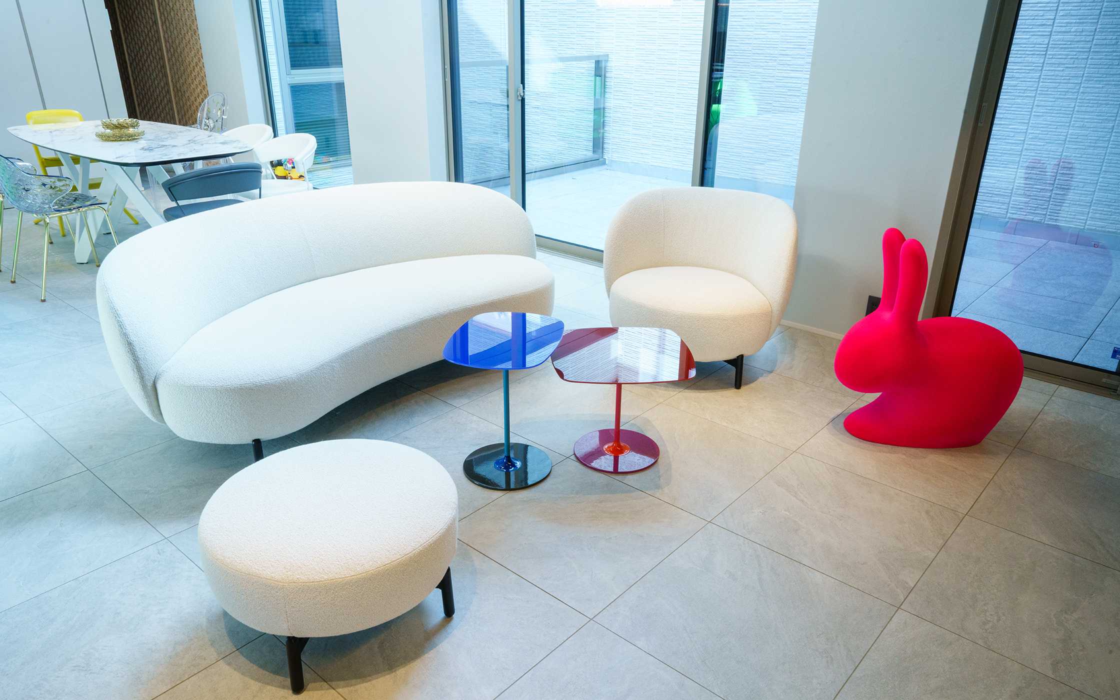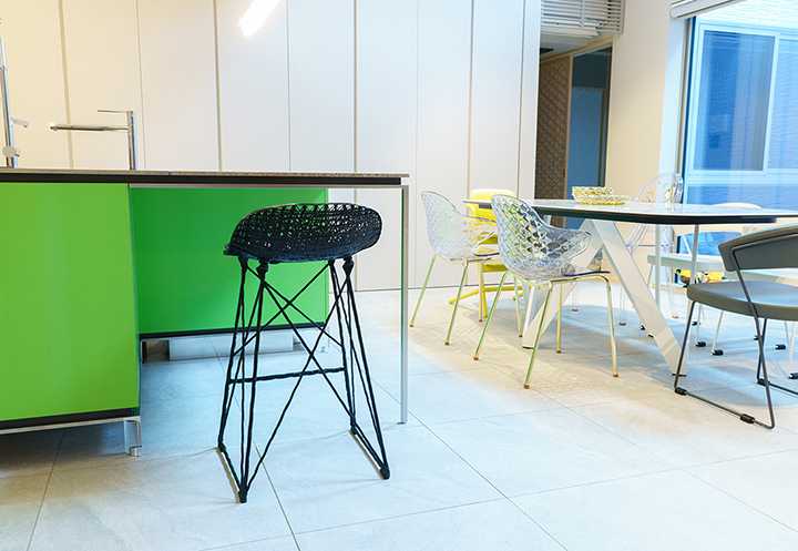 テーブル:ティエリー50L 、ティエリー33H、ルイゴースト(ミニオンズ)(Kartell) 、カーボンバースツールロー(moooi)、カーボンチェア⽤パッド (moooi)
