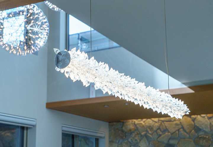 白を基調としたLDKでひときわ映えるキッチン。ペンダント照明「レイモンド」が上下階をつなげる