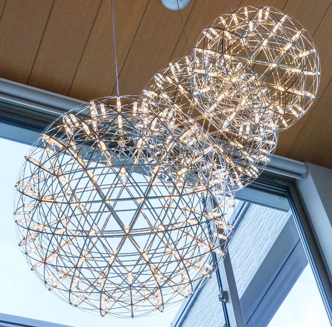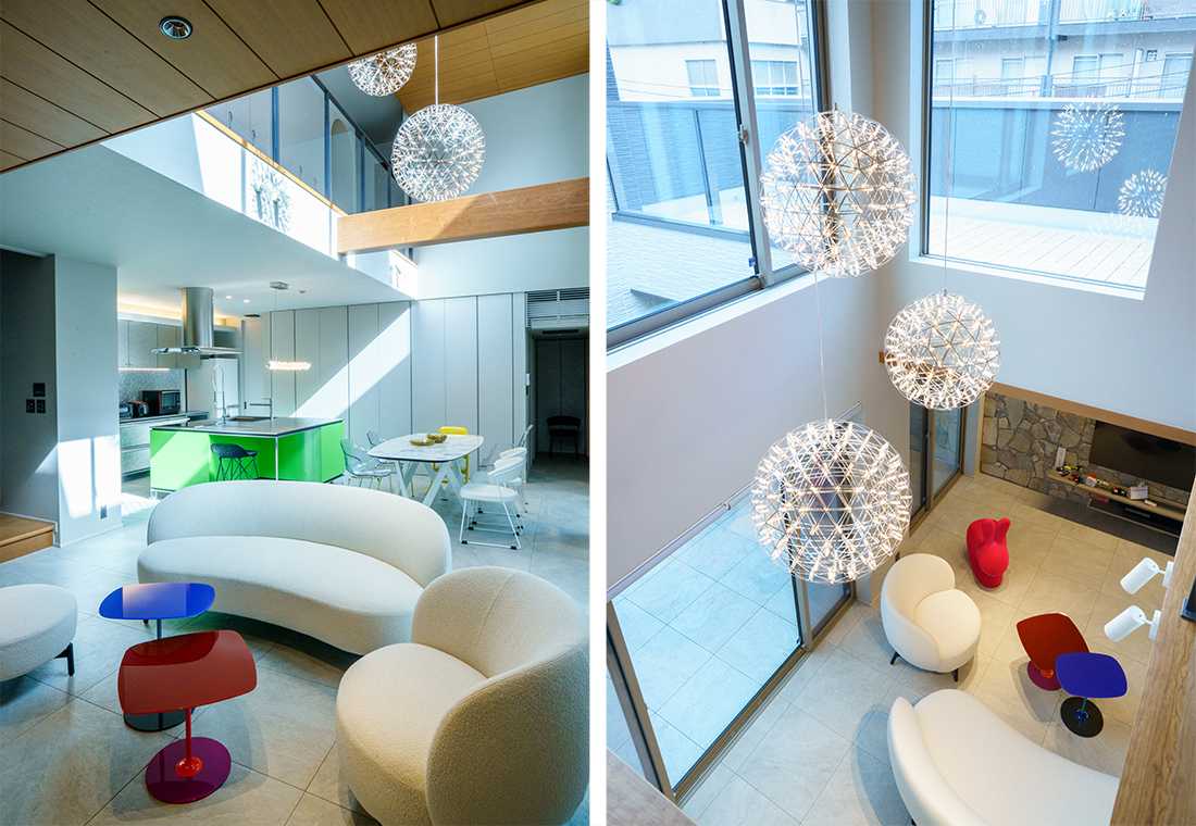10代の頃からエレキベースを演奏し、今も毎年趣味でバンド演奏をするというご主人。この家でのお気に入りの過ごし方は、「ルナム」に寝そべりながら吹き抜けに吊るした「レイモンド」越しに青空を眺めるひととき。一方、奥様はゆったりとくつろぐ家族を眺めながらキッチンで料理をつくる時間が至福だという。