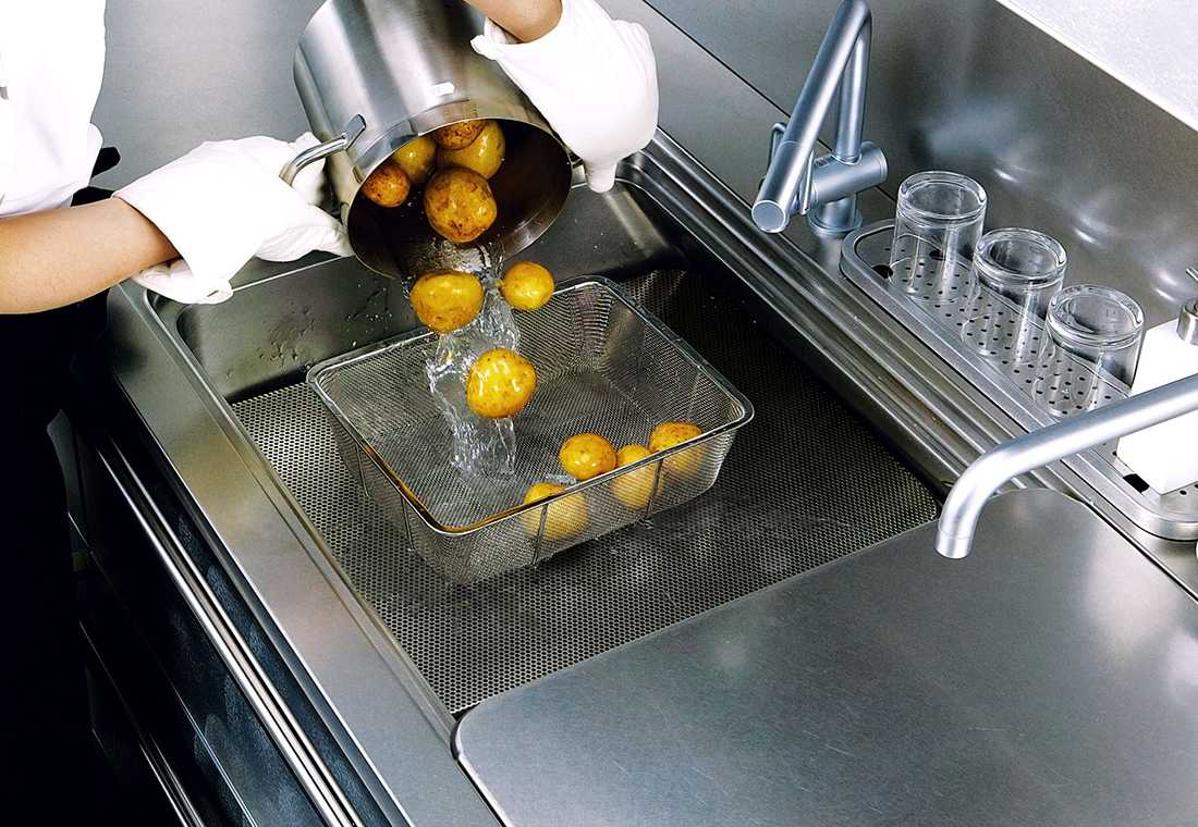 パンチング加工のマルチプレートはゆでこぼしや湯切りの時、水を流しながらの作業など自由自在な使い方ができます。