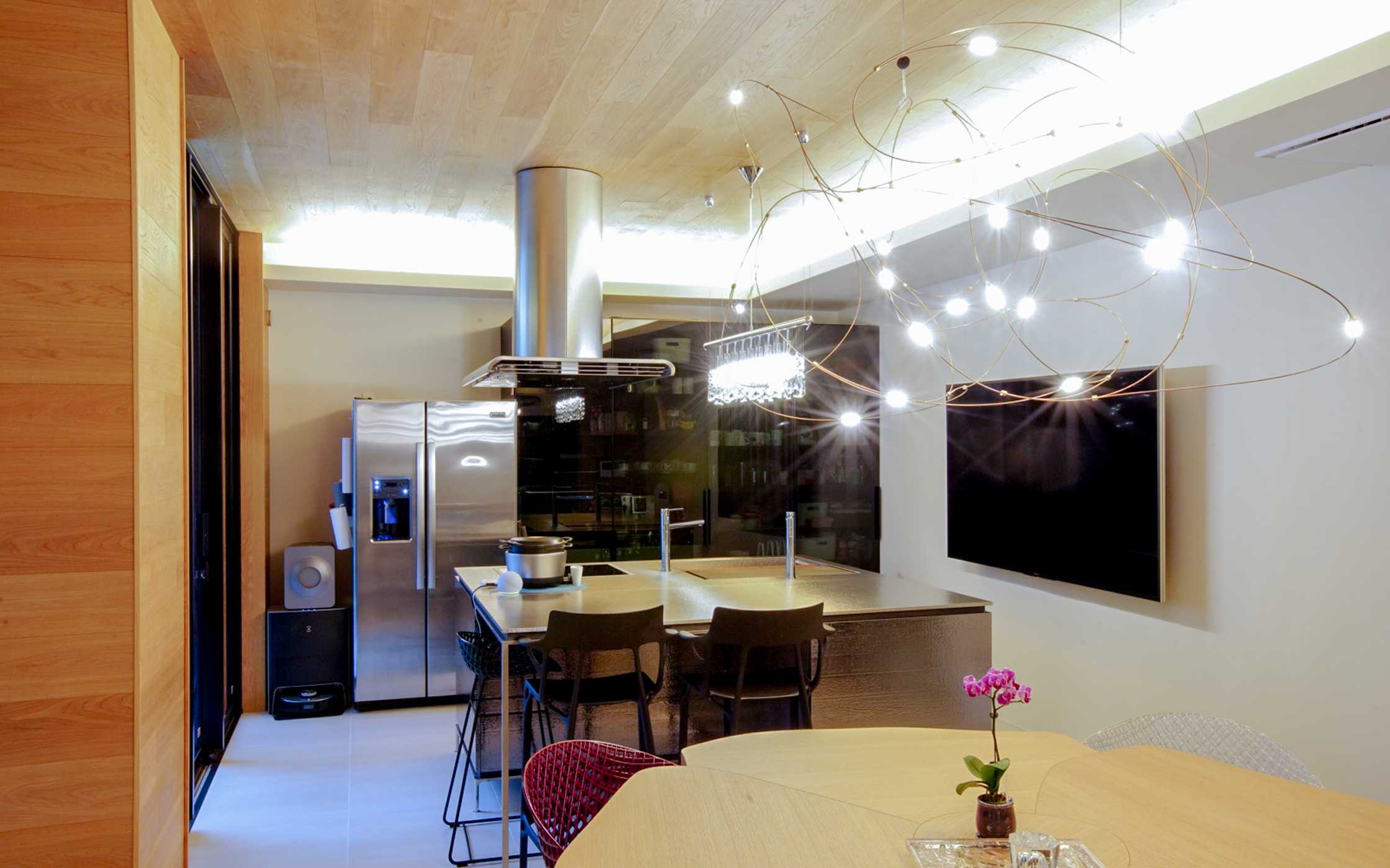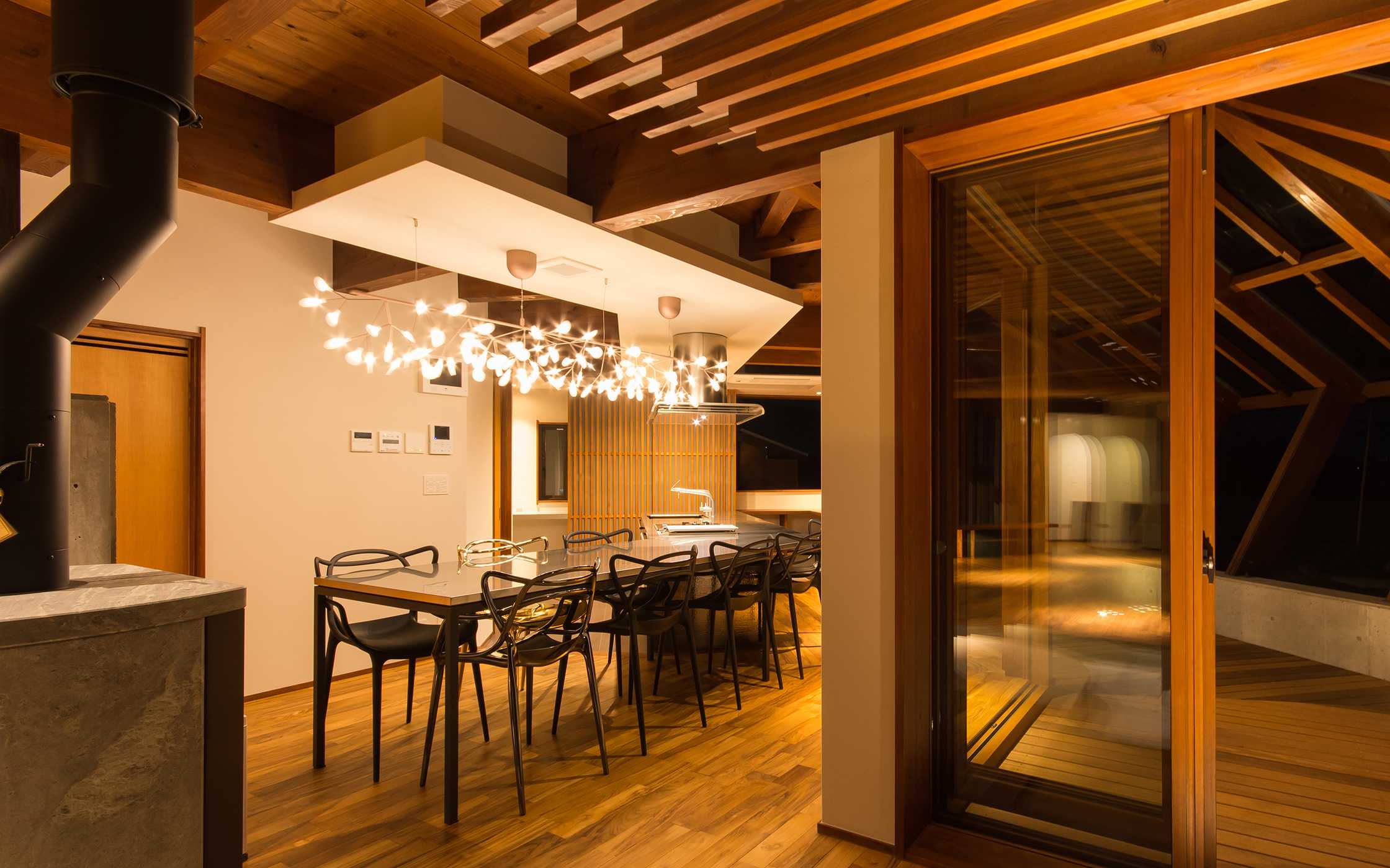 また、ダイニングテーブルは、部屋の中央に位置しながら動線に影響されず目線の高さに低く照明を設置できる唯一のスペース。そのため、照明のデザインを活かした空間演出が可能です。