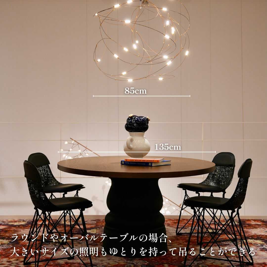 ダイニングのペンダントライトは、設置の高さによって空間の印象を大きく左右します。特に視線が抜ける開放感のあるデザインの照明は、低めに吊るすことでより印象に残る空間づくりが可能です。大胆な演出をする場合は、テーブルのサイズや形状に合わせ、テーブル面から60~70cm程度の高さに設定すると、フォーカルポイントとしての存在感を際立たせることができます。