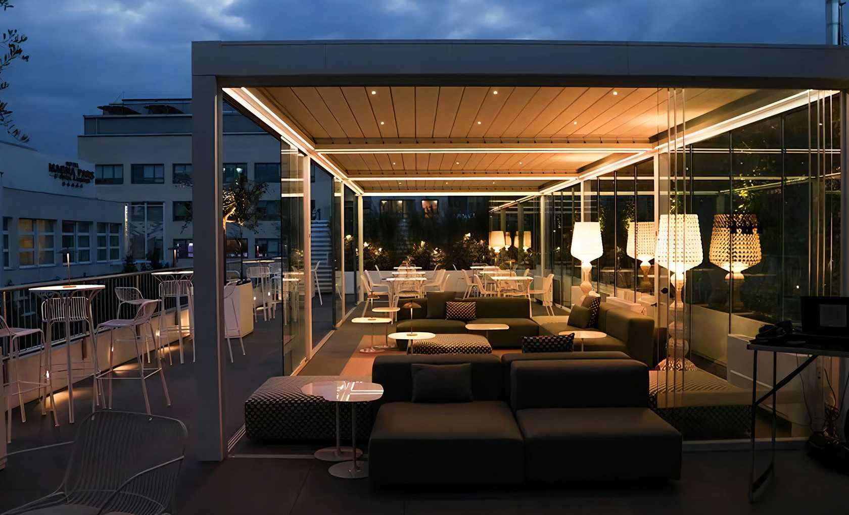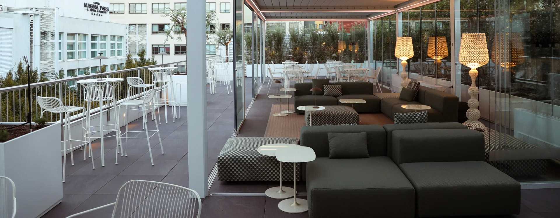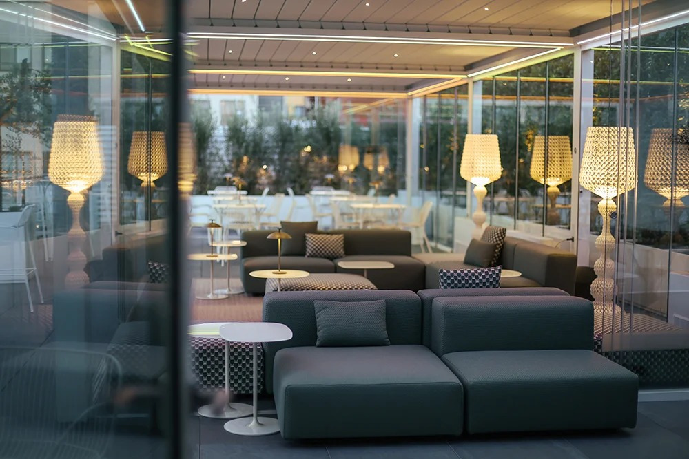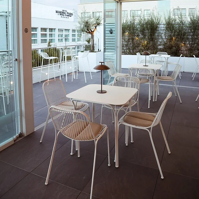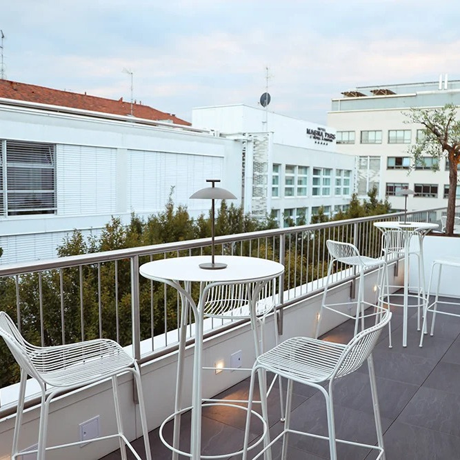 そんな特別なホテルの屋上デッキには、Kartellのアウトドアコレクションが多数採用されています。中でも「ハイレイ」シリーズは、静かな屋上で心地よい風を感じながら、ゲストがゆったりとくつろぐための場に相応しく、テーブルやチェア、ハイテーブル、スツールが、ホテルの上質な世界観に自然に溶け込み、軽やかで洗練されたアウトドア空間を演出しています。