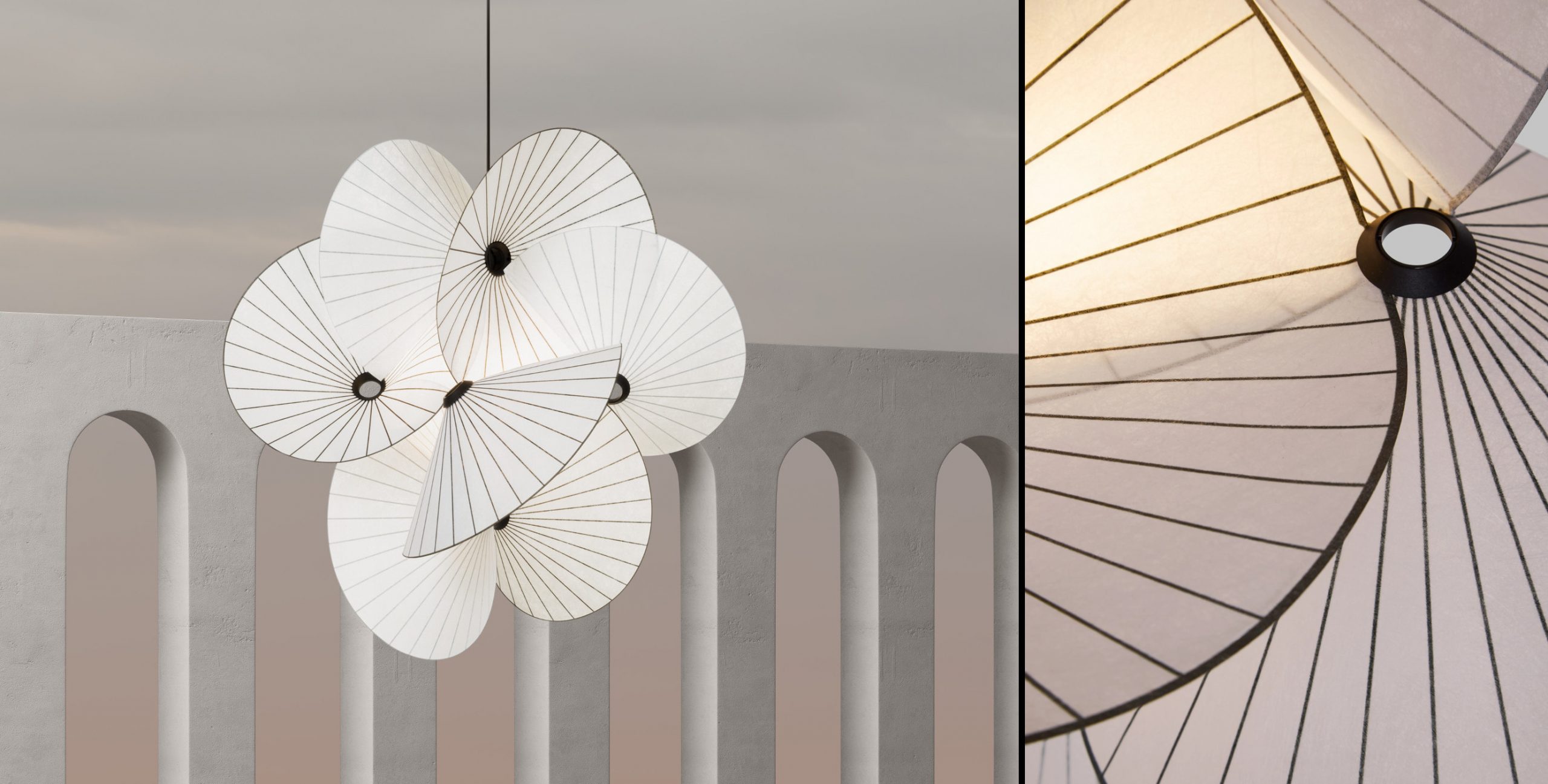 紙の捻れや回転からインスパイアされた軽やかなデザインのサスペンションライト。流れるように繋がったシェードは空気の流れを受けてゆっくりと回転しながら、終わりのない螺旋を描きます。