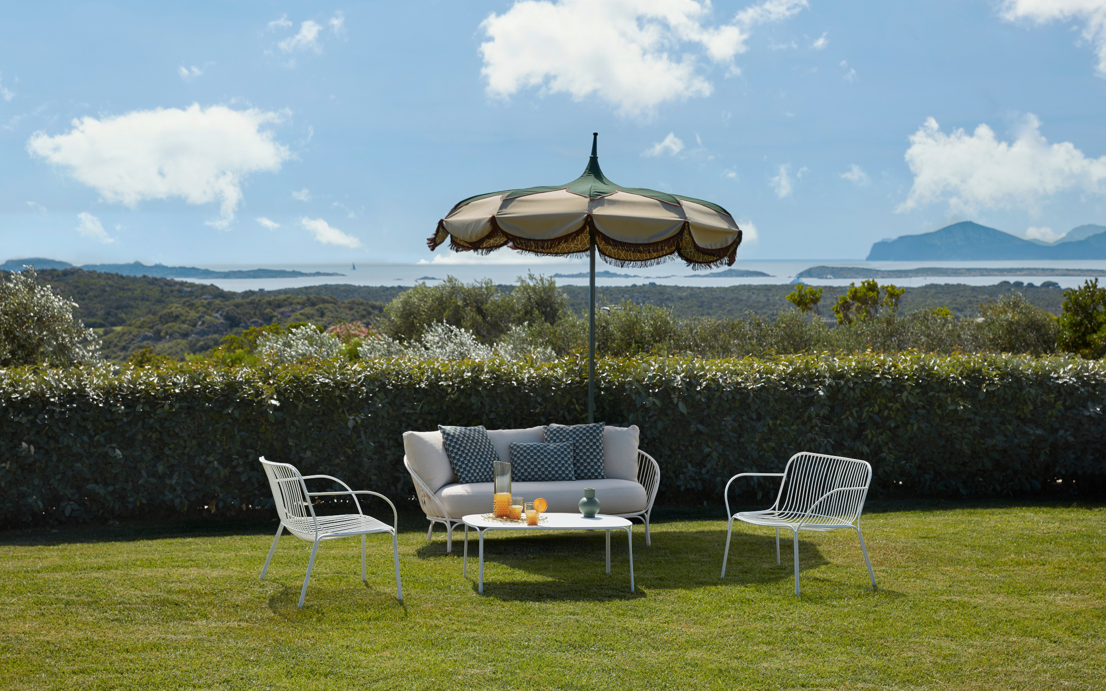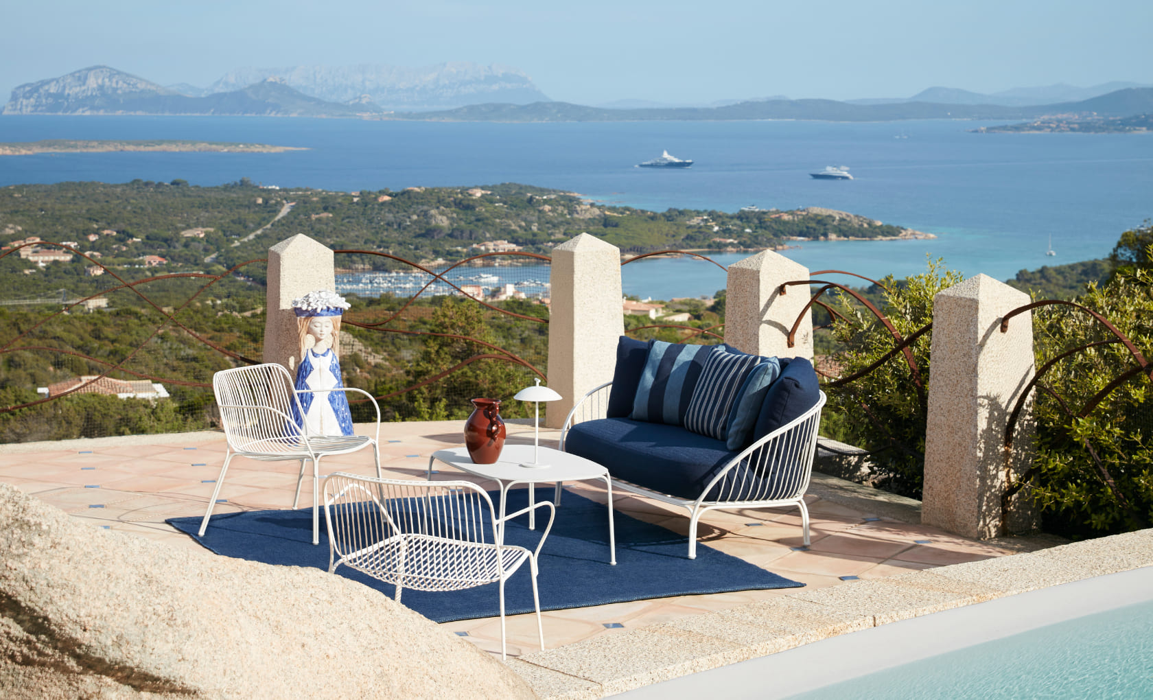 サルデーニャの自然と風景、そしてカルテルのデザインが響き合いながら、それぞれの場所に調和する美しさを描き出しています。