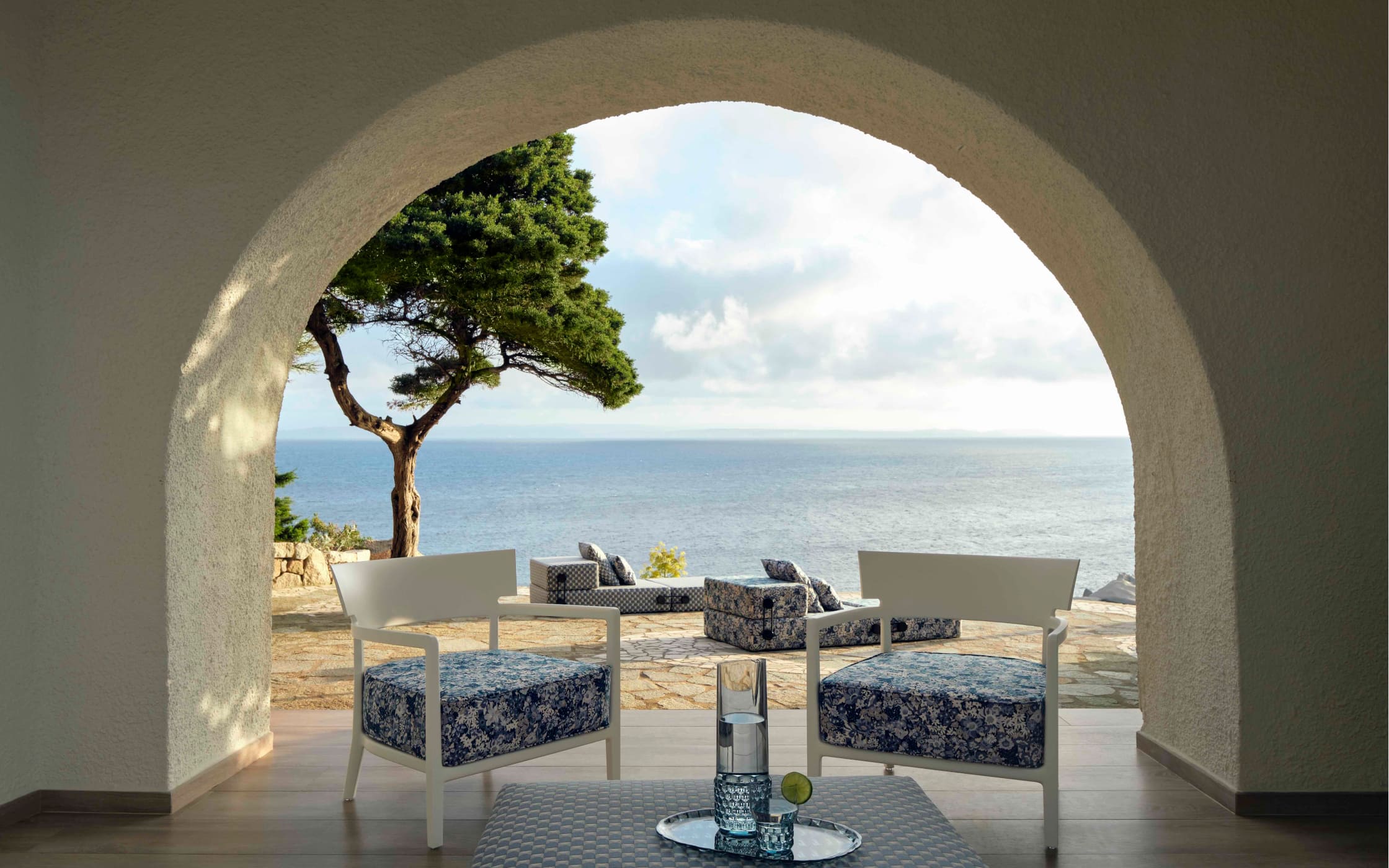 屋内から海を望むアーチには、フローラル柄が印象的な《カーラマットアウトドア リバティ》のチェアが並び、海と空の青を背景に、その白いフレームが建築と自然をつなぐ架け橋のような役割を果たします。