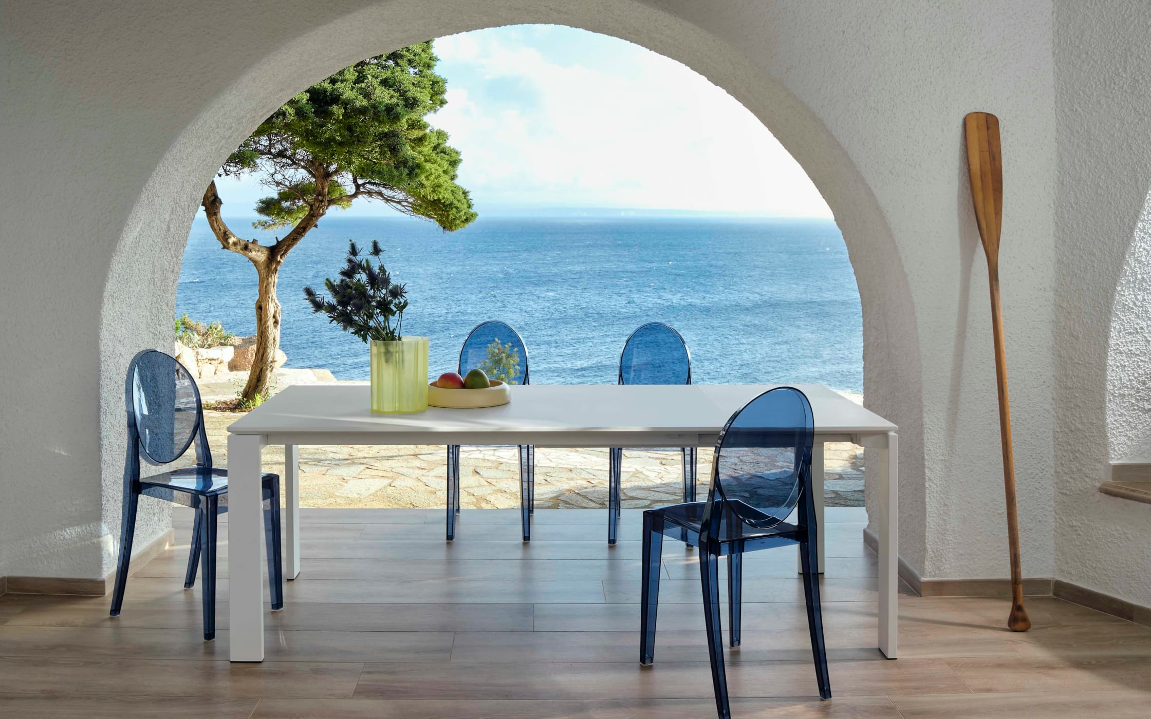 もう一室では、地中海の陽光が降り注ぐダイニング空間に、クリアブルーの《ビクトリアゴースト》と、洗練されたデザインの《フォー》テーブルがセッティングされ、アートピースのような静けさと軽やかさが漂います。