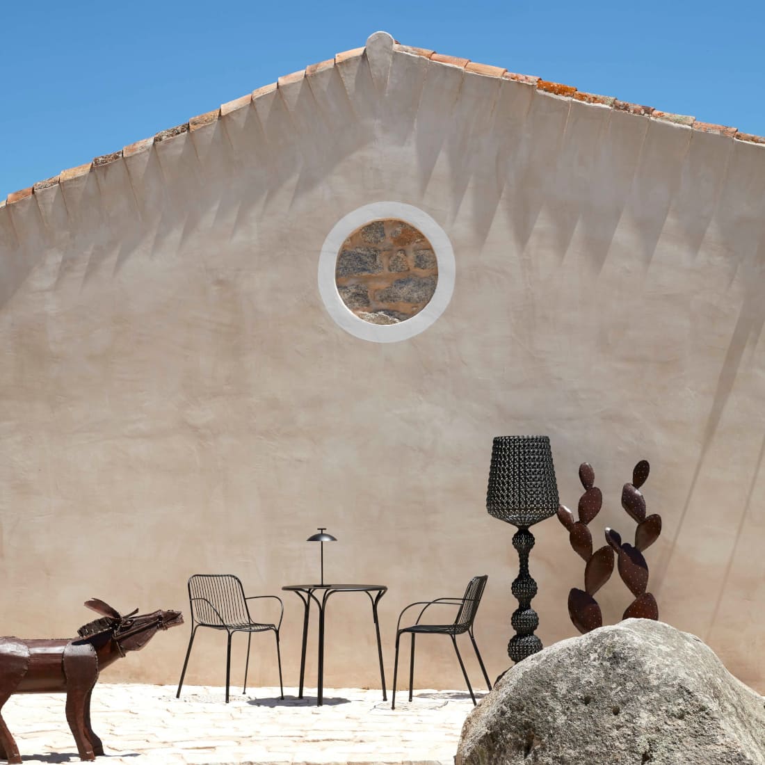 この地で長く受け継がれてきた石造りの住居“スタッツォ”をリノベーションしたこの宿は、建築、自然、そして静寂が織りなすスピリチュアルな隠れ家です。樹齢を重ねたオリーブの木々と乾いた大地、静けさに包まれた空気。その背景に、Kartellの《ハイレイ》シリーズが、控えめでありながらも確かな存在感で寄り添います。
