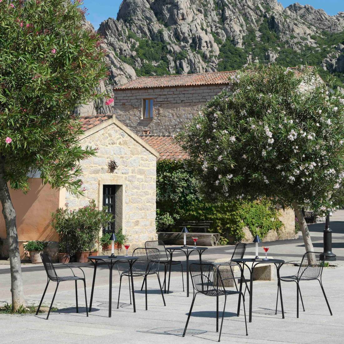 サン・パンタレオの広場では、《ハイレイ》が強い日差しのもと、しなやかにその存在を主張します。石畳と木漏れ日、そして彫刻のようなチェア。穏やかな夏の時間に、静かに溶け込むデザインがそこにありました。