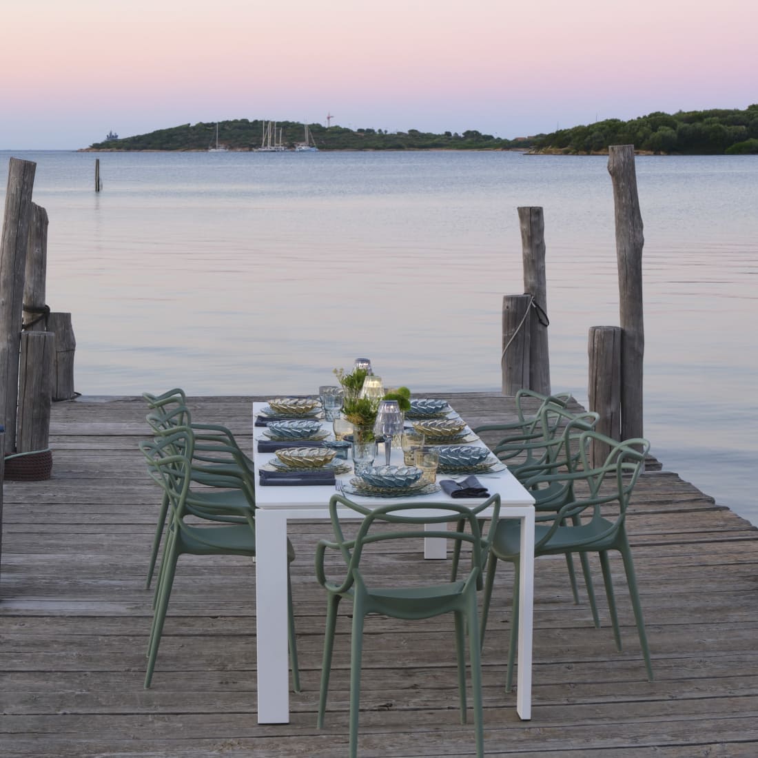 そして、マメル・クニャーナの桟橋では、《フォー》と《マスターズ》のダイニングセットが海を背景に配置され、テーブルの上には《バッテリー2》のやわらかな灯りがともります。潮風を感じながら過ごす食事のひとときに、カルテルのプロダクトが静かに寄り添います。
