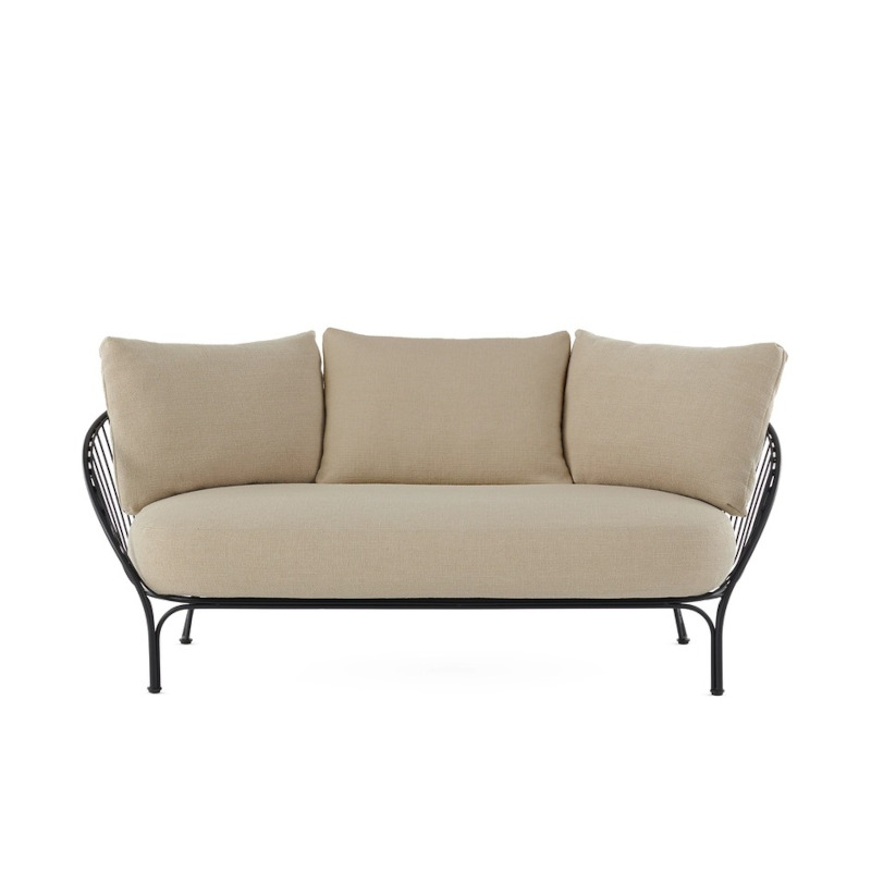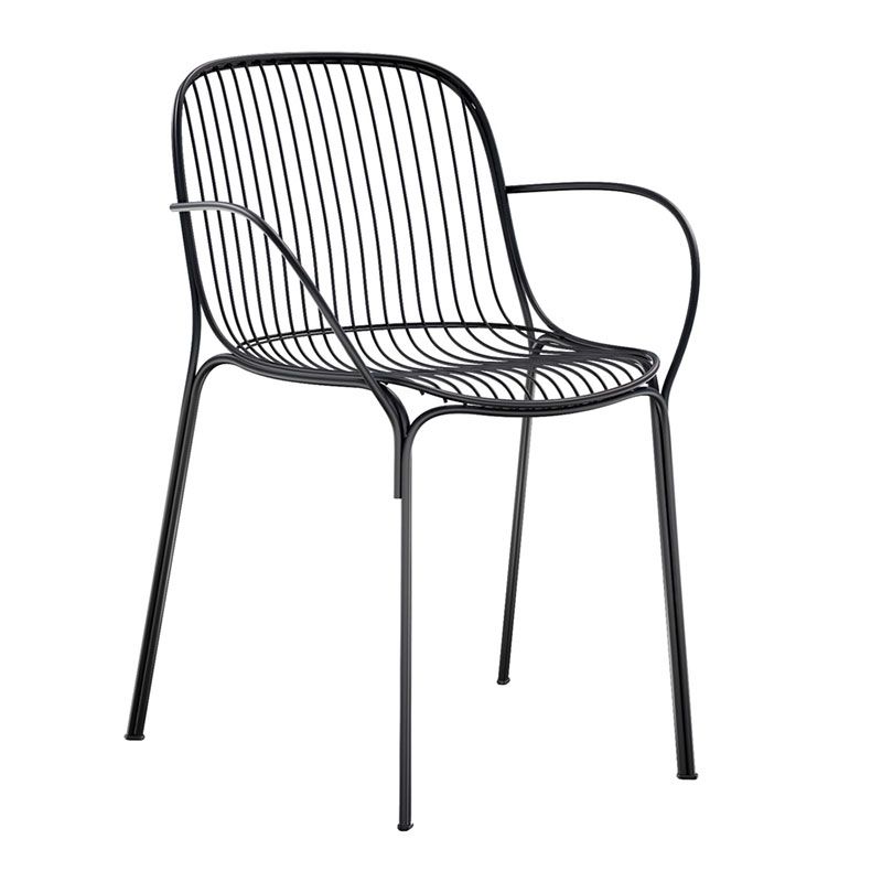 石積みの建物が印象的なテラスでは、ワイヤー状の繊細なデザインが特徴の《ハイレイソファ》と《アームチェア》が、深く腰を預けたくなるような寛ぎの空間を演出。朝の光も夕暮れの影もよく似合います。