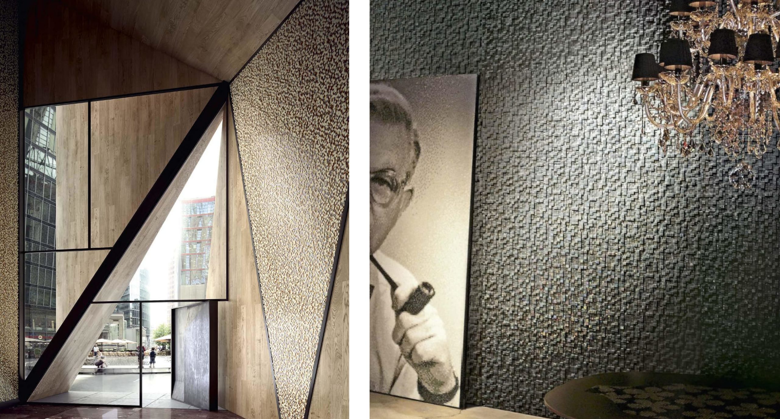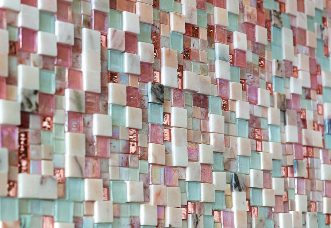 数種類のモザイクを異なるサイズ・厚みで組み合わせた、3次元のモザイク。平滑なタイルでは決して到達できない、圧倒的な存在感が魅力です。