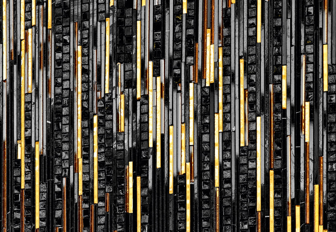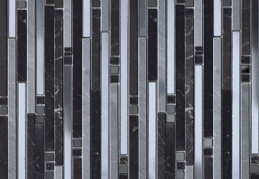 ガラスモザイクやマーブルをミックスし、極細の長方形や正方形を巧みに配置しました。幾何学的な模様が連なるその姿は、まるで「滝」を想起させます。