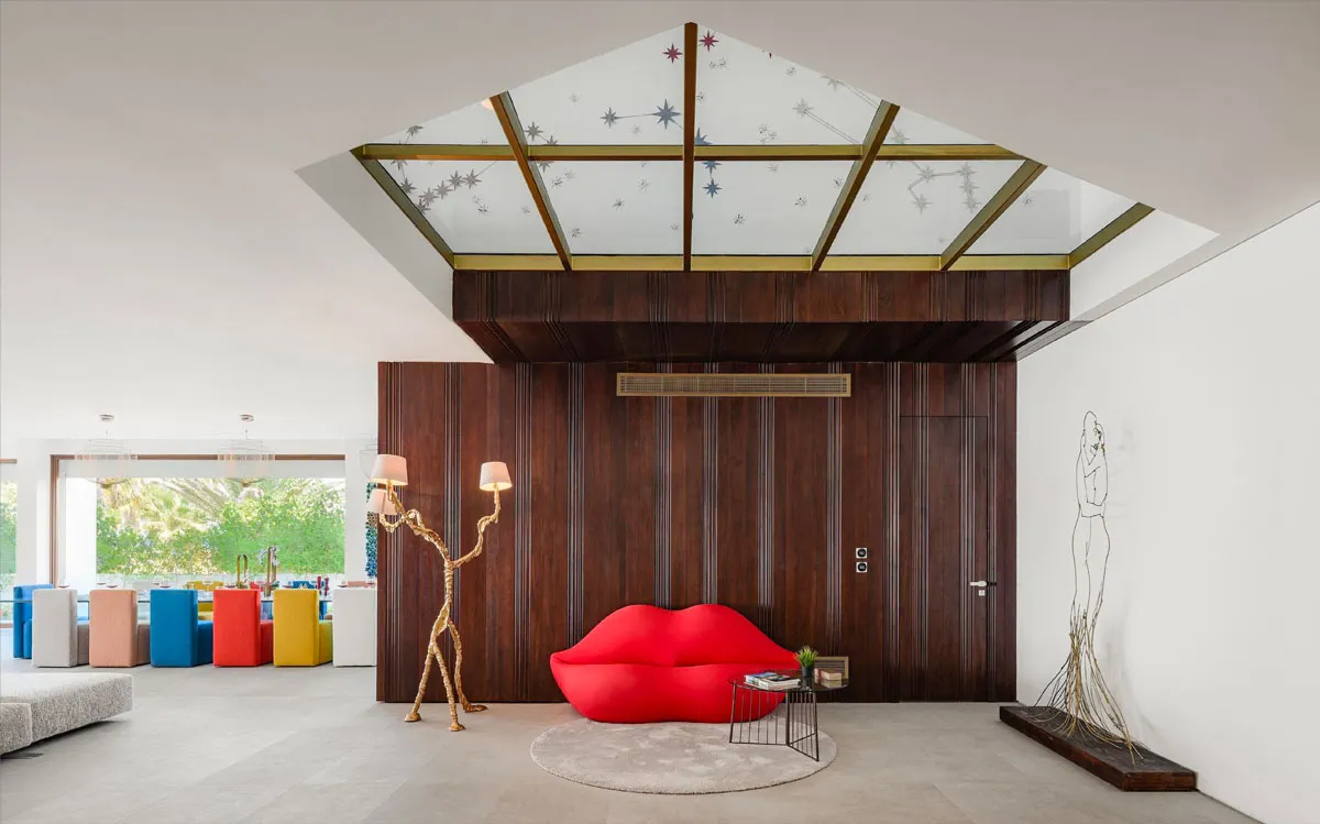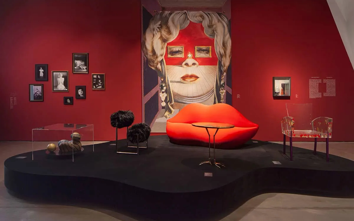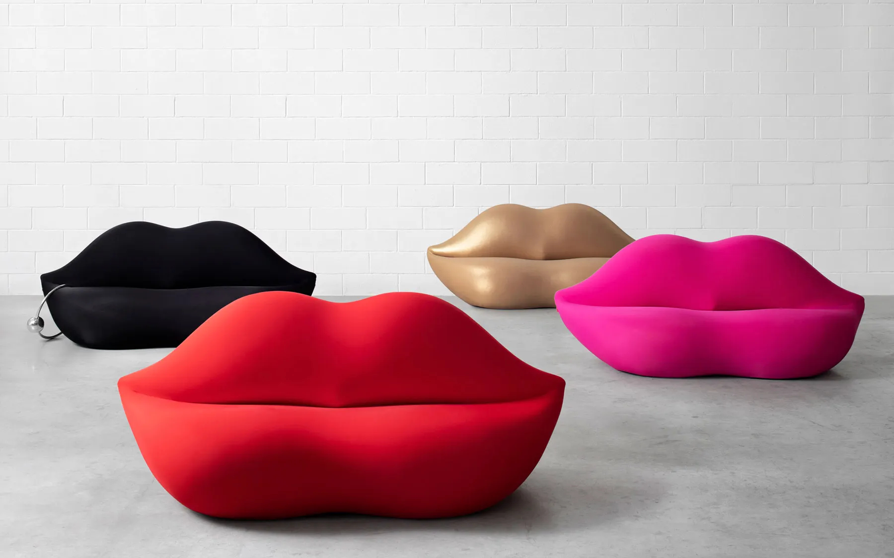 この技術により、微妙に非対称な唇の複雑な三次元曲面が精巧に再現されました。熟練職人による手作業で成形され、赤い伸縮性ファブリックで覆われた表面は、視覚的な官能性と実際の座り心地を両立させています。全長約210cm、奥行80cm、高さ82cmという寸法は、2~4人が腰掛けるのに十分なサイズです。
