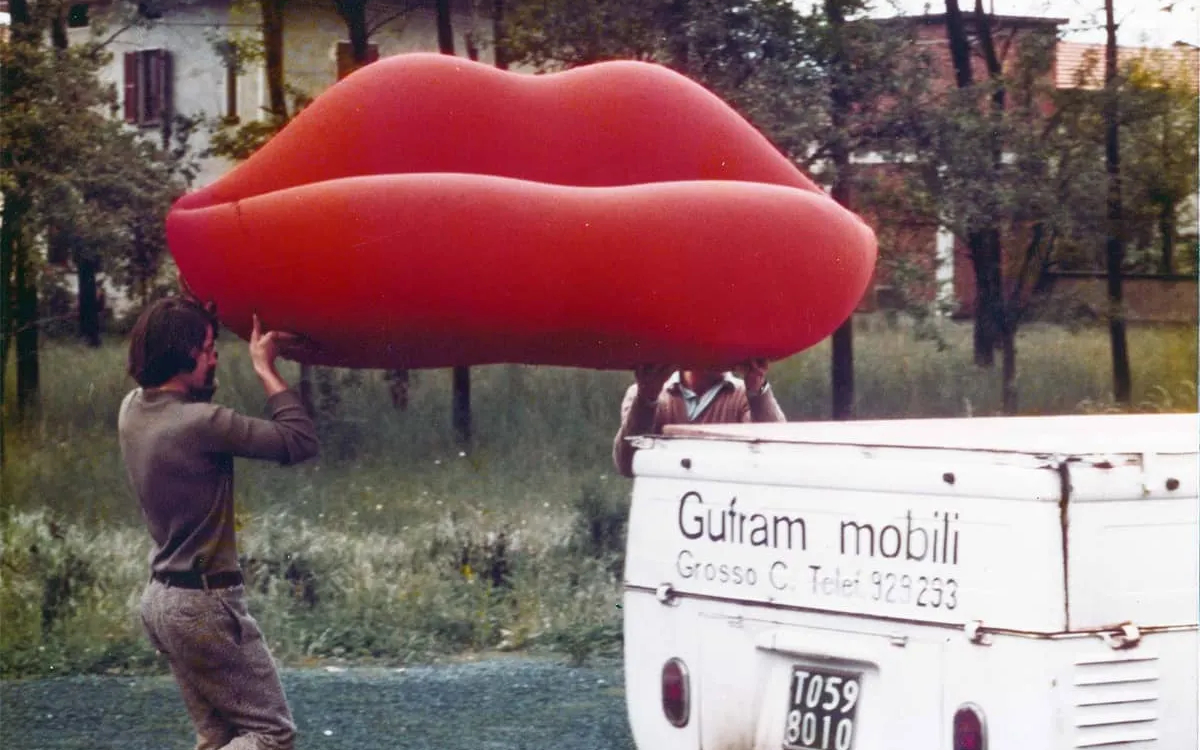 ボッカソファは、ミラノのフィットネスセンター「コントゥレーラ」の内装プロジェクトとして構想されました。グフラム社の工場で赤い光沢のあるラテックスゴムでコーティングされた試作品が、偶然訪れた『カーサ・ヴォーグ』誌の編集者の目に留まり、1970年11月に掲載されると、デザイン界のアイコンとなりました。「外見が存在の質よりも優先される時代の象徴」とデザイナー自身が語るように、ボッカは表層的な美への皮肉と賛美を同時に表現しています。