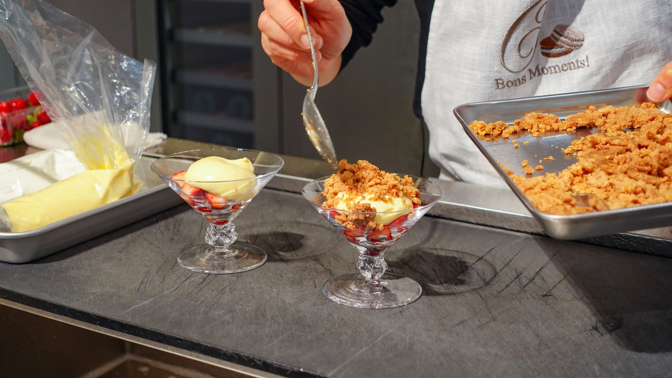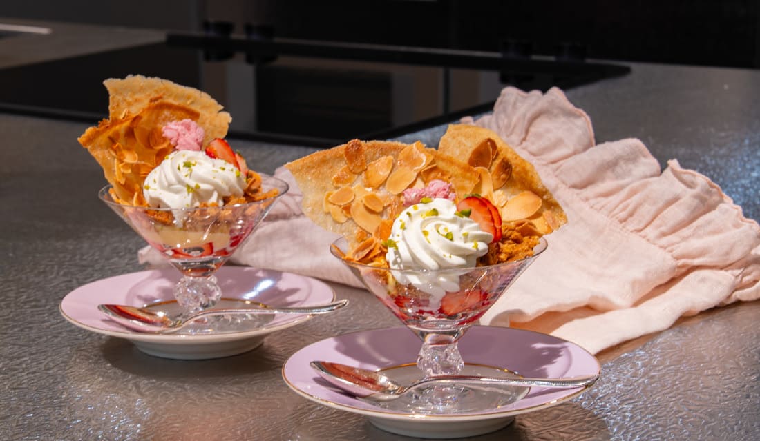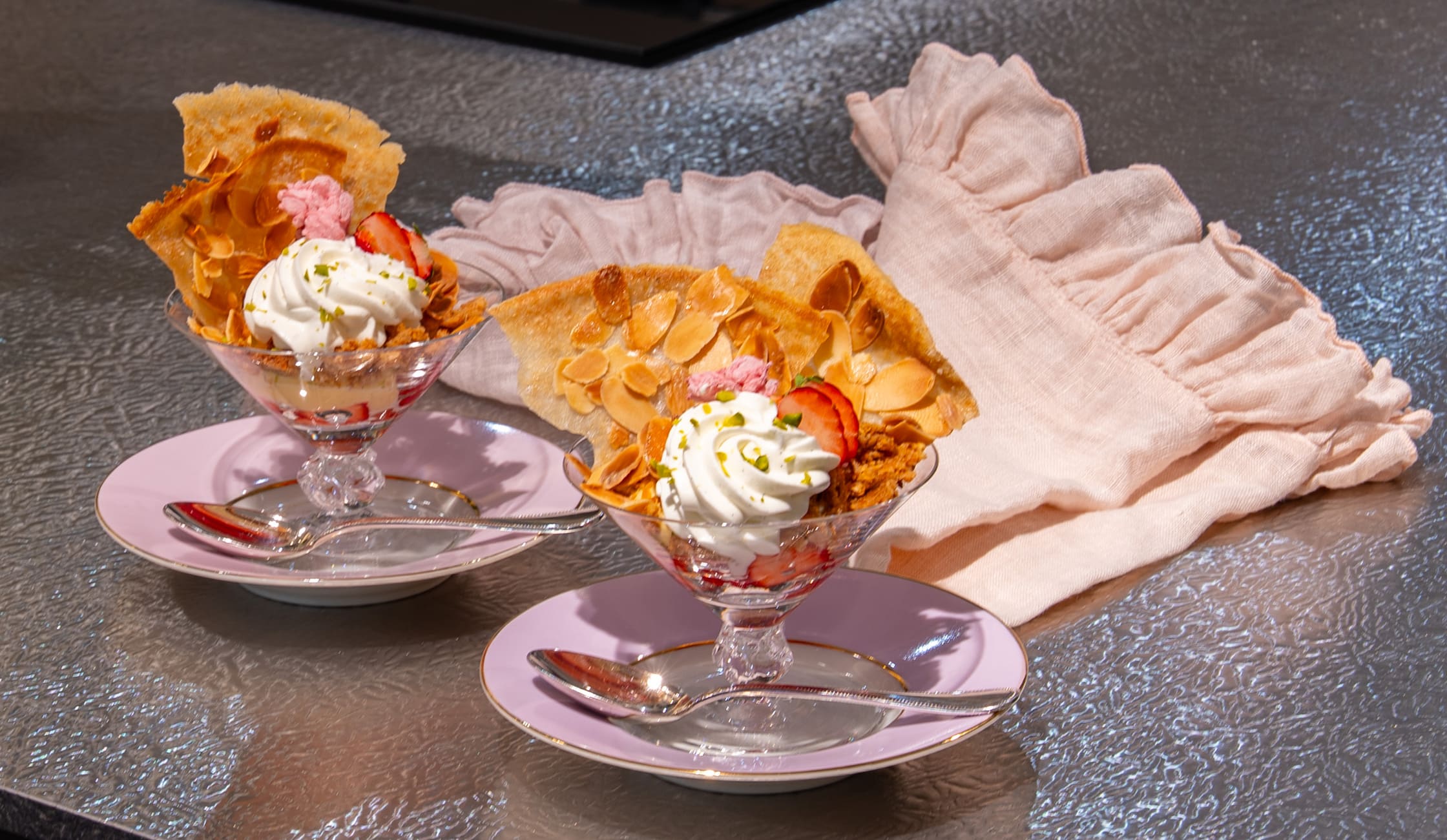 今回は、こんな季節の変わり目に作りたい、いちごとクリームを重ねたグラスデザートです。甘酸っぱいいちご、キルシュの香り、滑らかなヴァニラのクリーム、サクサクしたクランブルやパリパリの生地をトッピングして食感も楽しみたい。